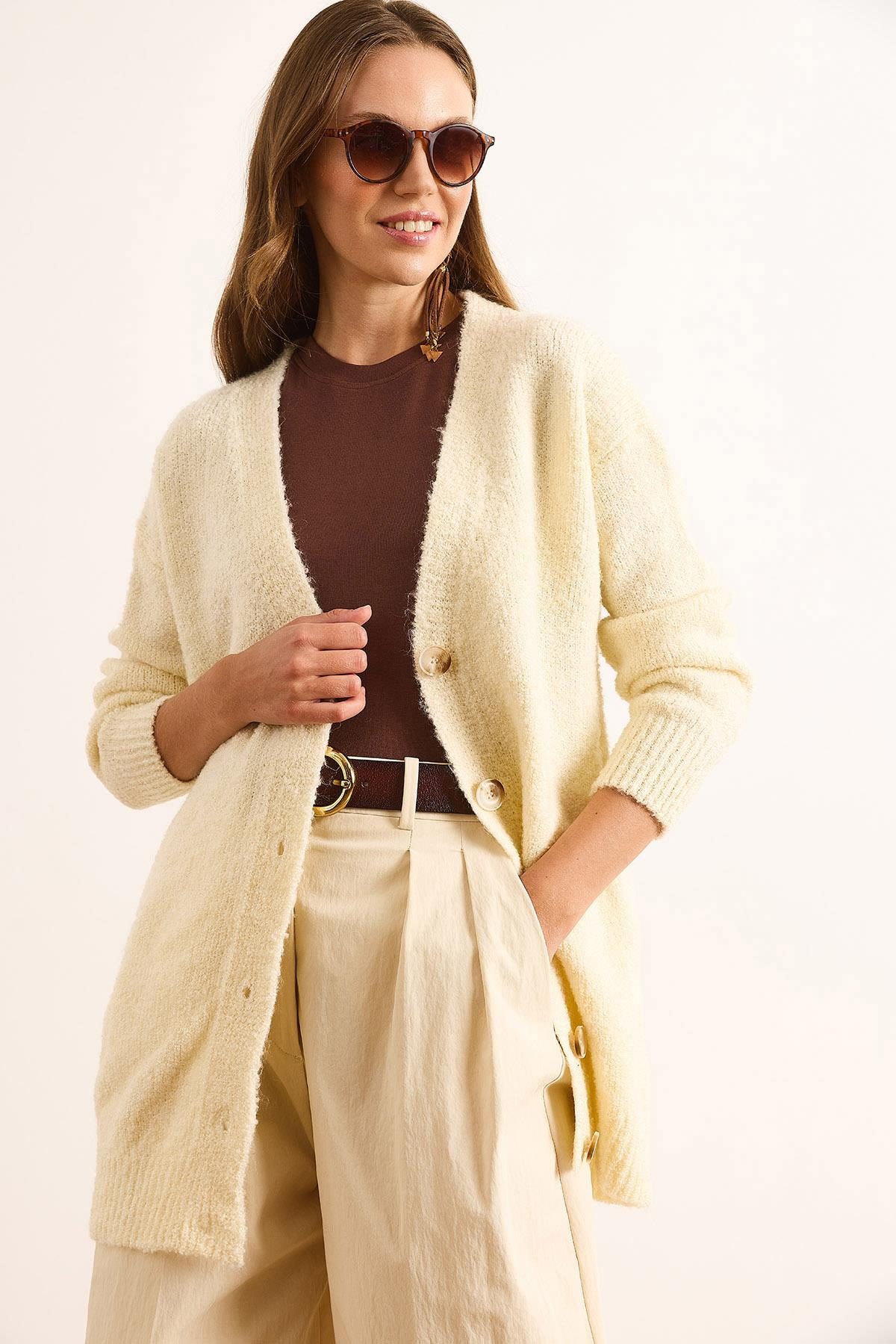 5 Düğme Yumuşak Dokulu Kalın Uzun Hırka Ekru (HRK-19000375)