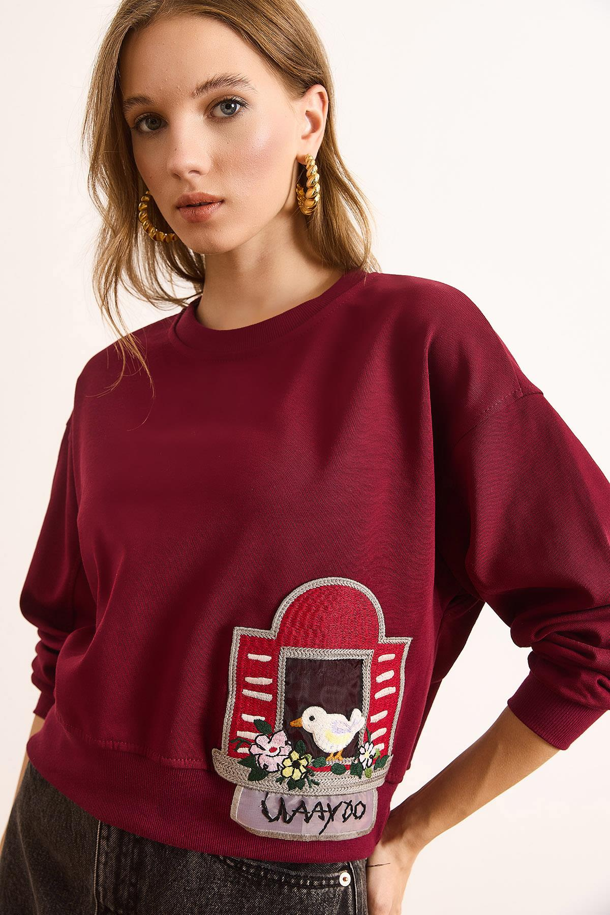 Aplike Detaylı Şardonsuz Kalın Crop Sweatshirt Bordo