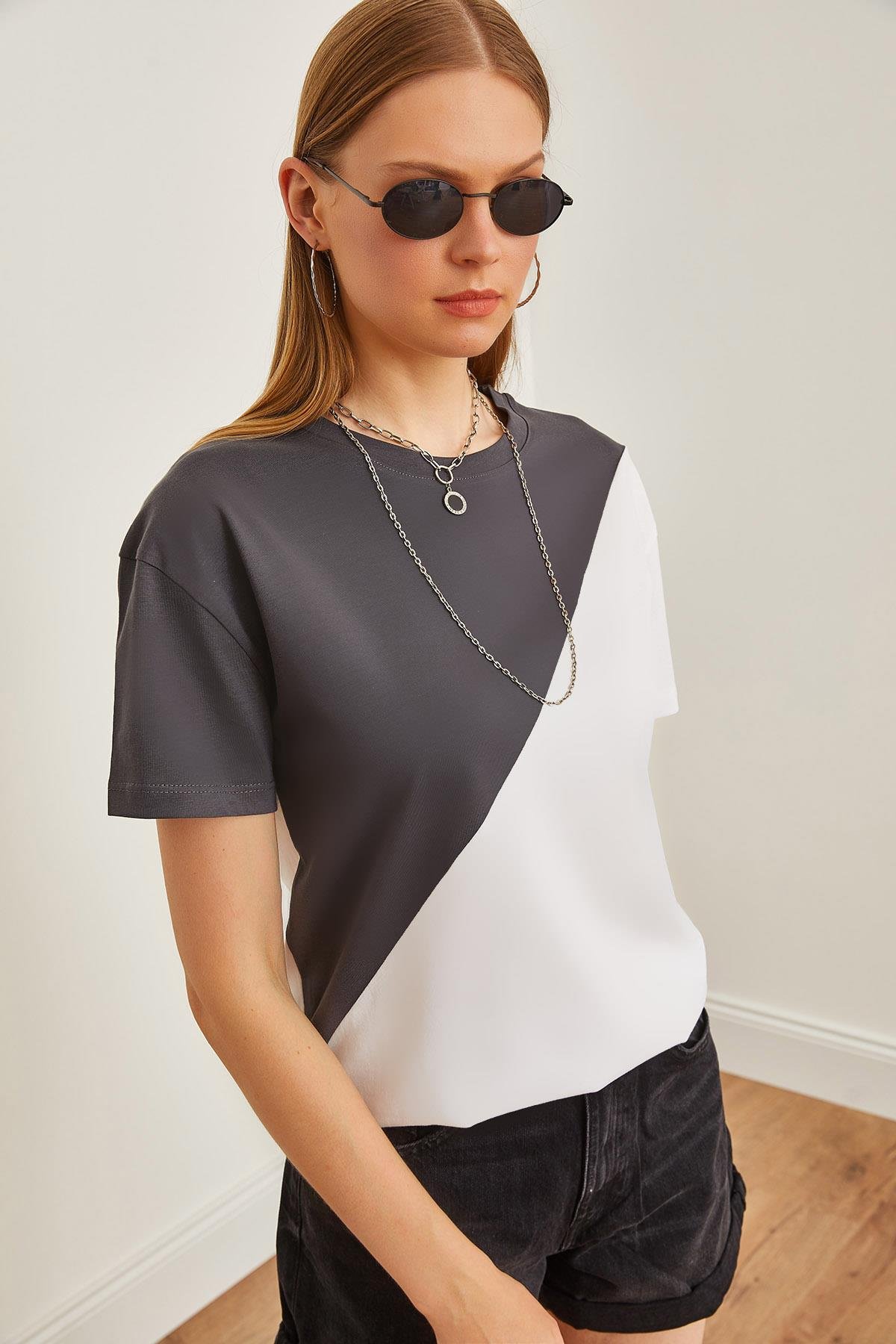Asimetrik Bloklu Tişört Füme Beyaz