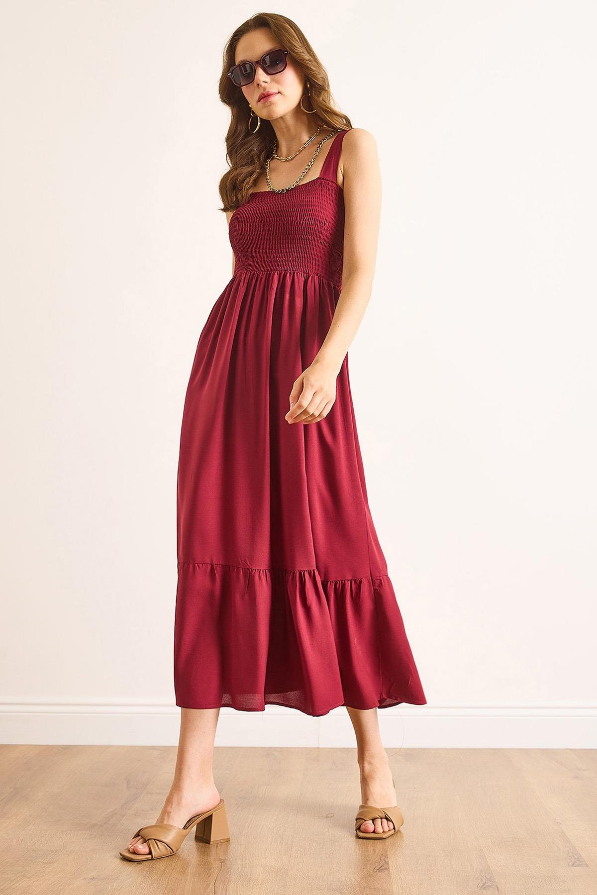 Askılı Gipeli Midi Dokuma Viskon Elbise Bordo (ELB-19002102)