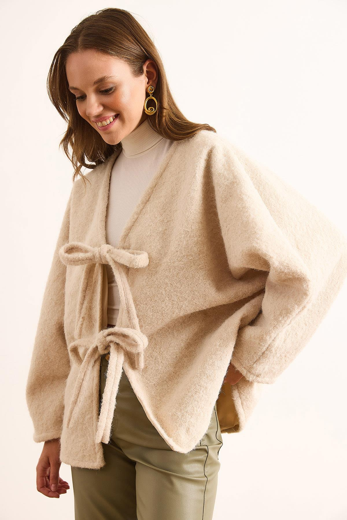 Astarlı Bağcık Detaylı Kırçıllı Kaşe Ceket Ekru (CKT-19000460)