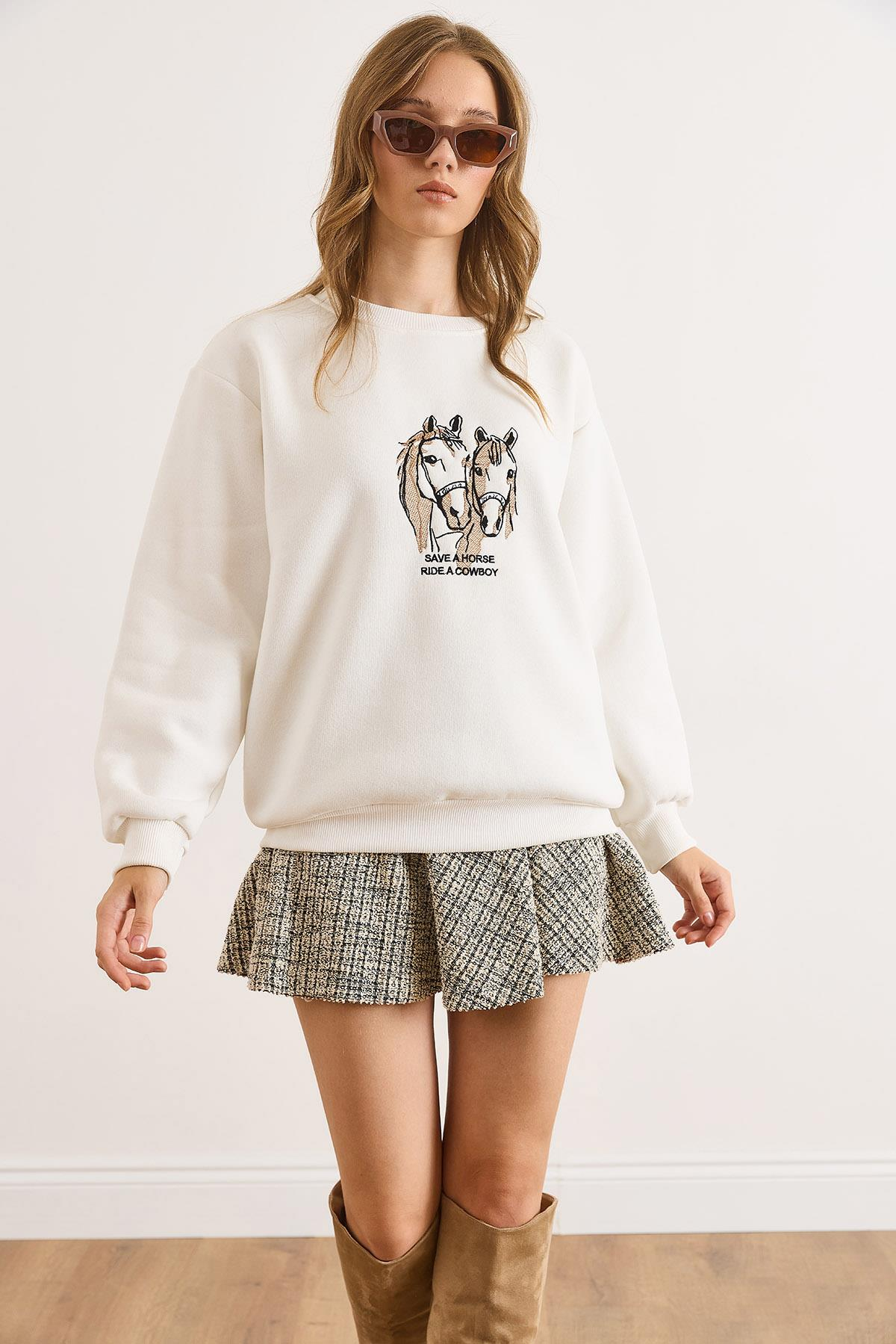 At Nakışlı Rahat Kalıp Şardonlu Sweatshirt Ekru (SWT-19000756)