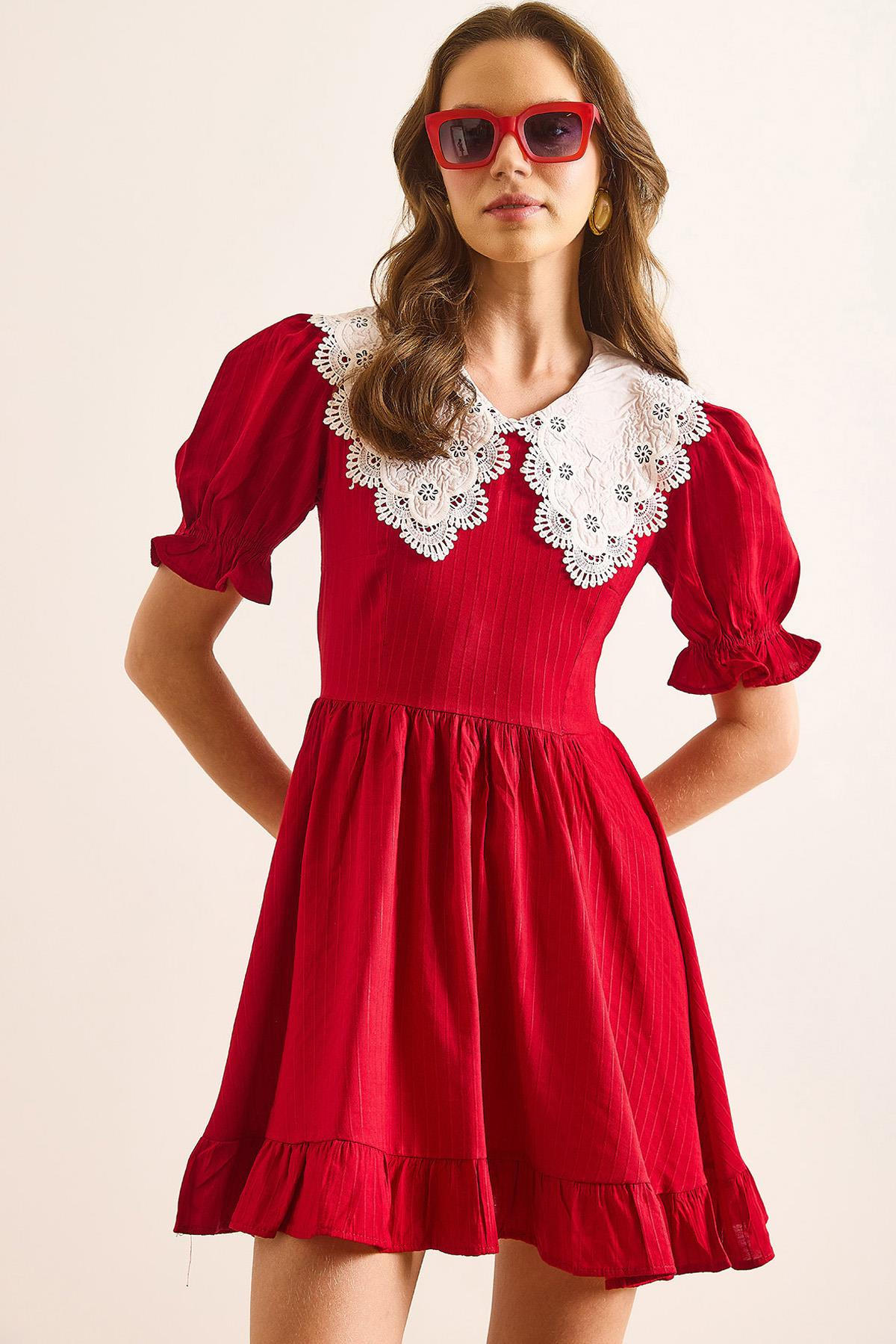 Bebe Yaka Mini Dökümlü Elbise Kırmızı