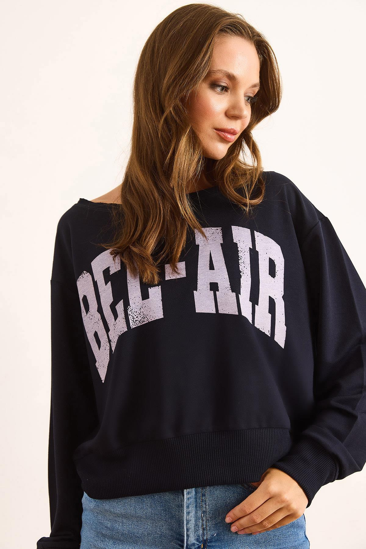 Bel Air Baskılı Kayık Yaka Sweatshirt Lacivert (SWT-19000724)