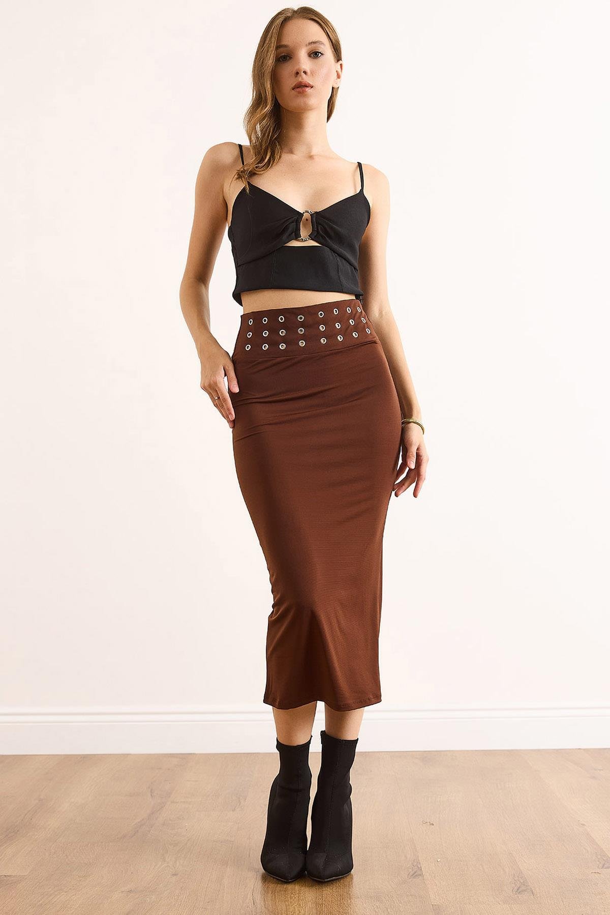 Beli Kuş Gözü Detaylı Midi Sandy Etek Kahverengi (ETK-19000352)