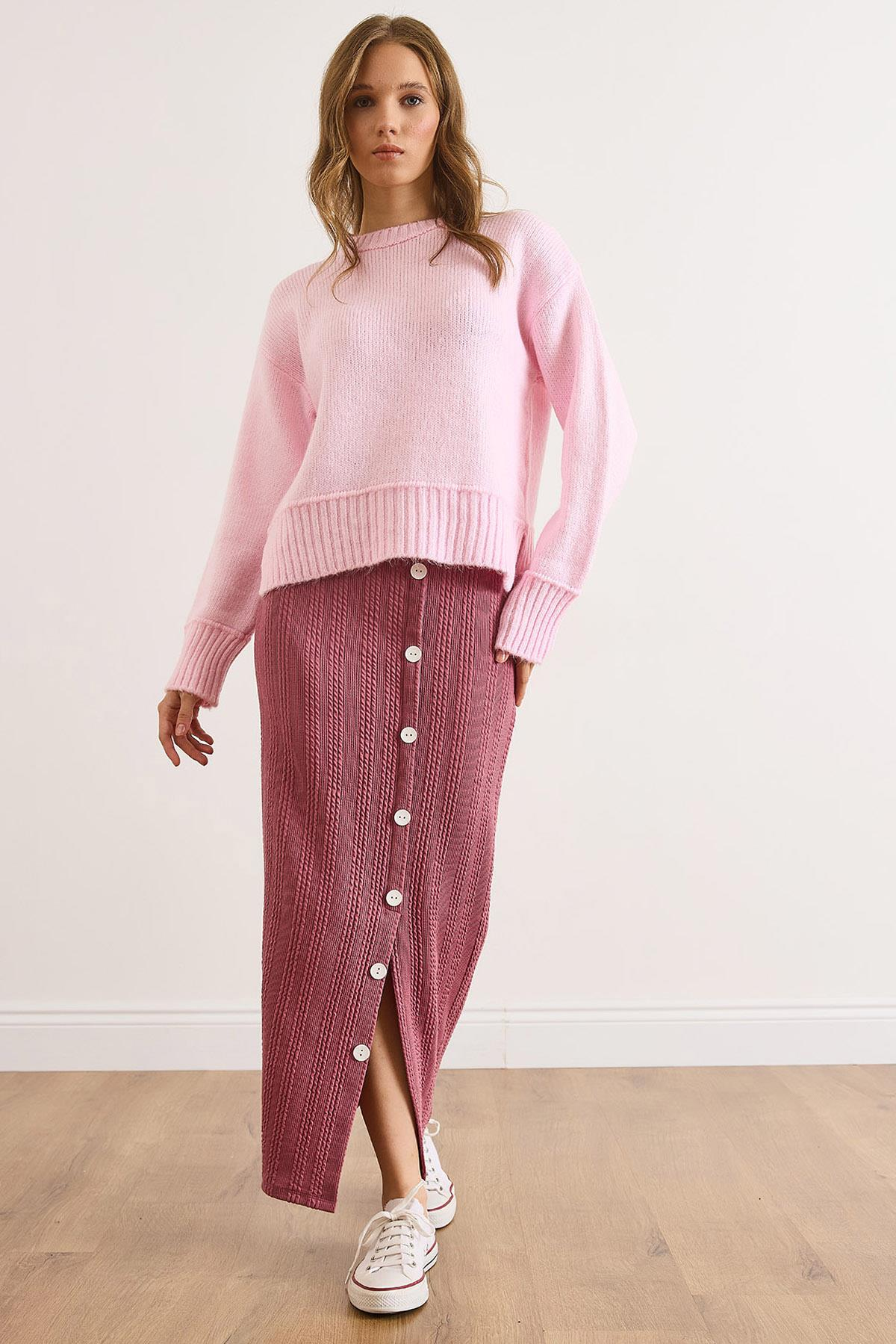 Beli Lastikli Düğmeli Yırtmaçlı Uzun Etek Gül Kurusu (ETK-19000293)