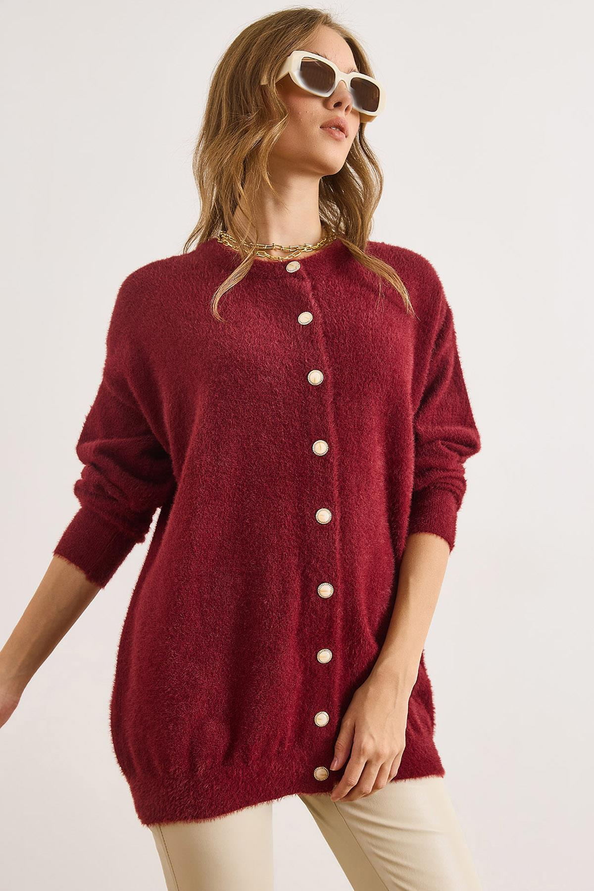 Bisiklet Yaka Düğme Detaylı Uzun Sakal Hırka Bordo (HRK-19000413)