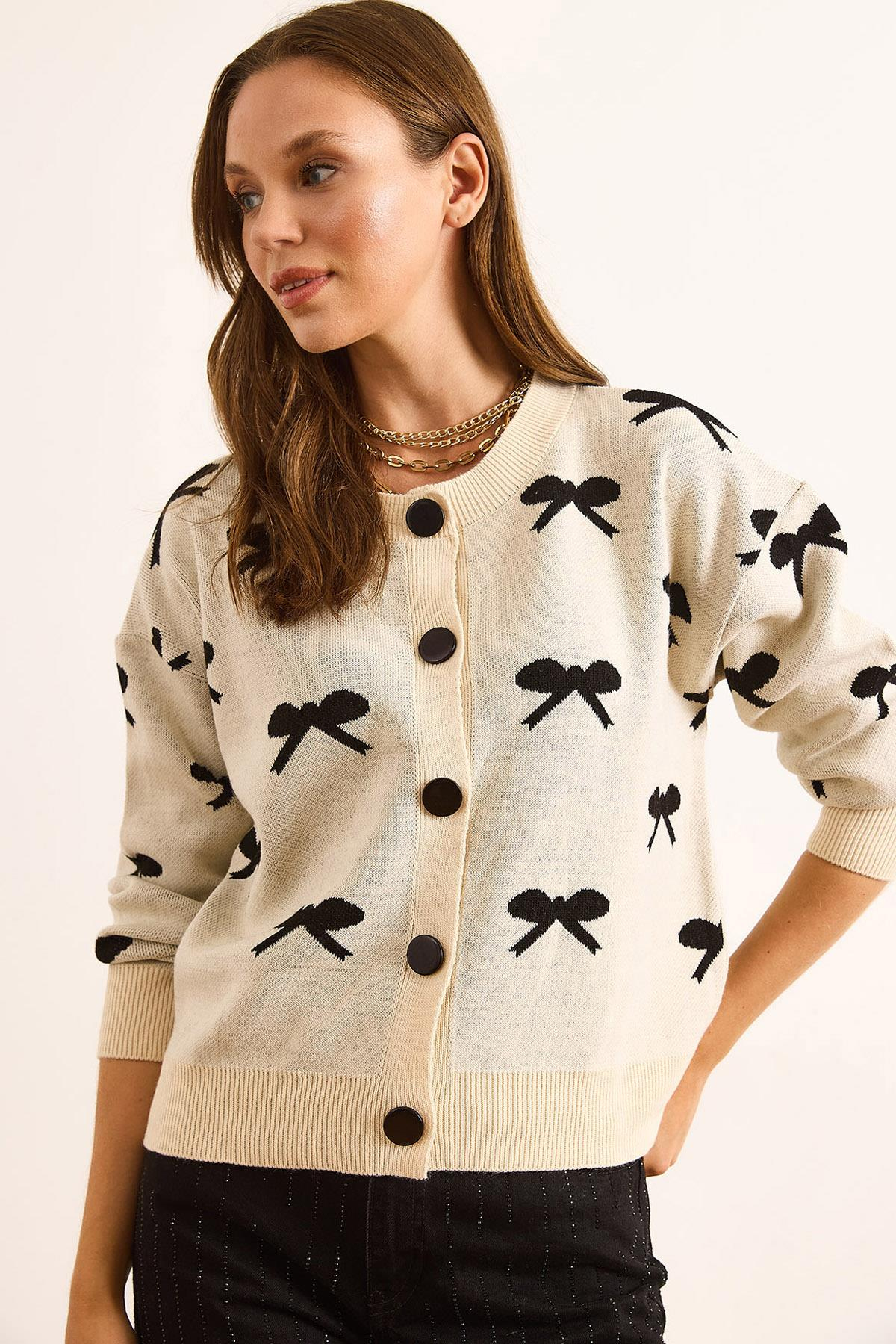 Bisiklet Yaka Fiyonk Detaylı Düğmeli Hırka Ekru (HRK-19000363)
