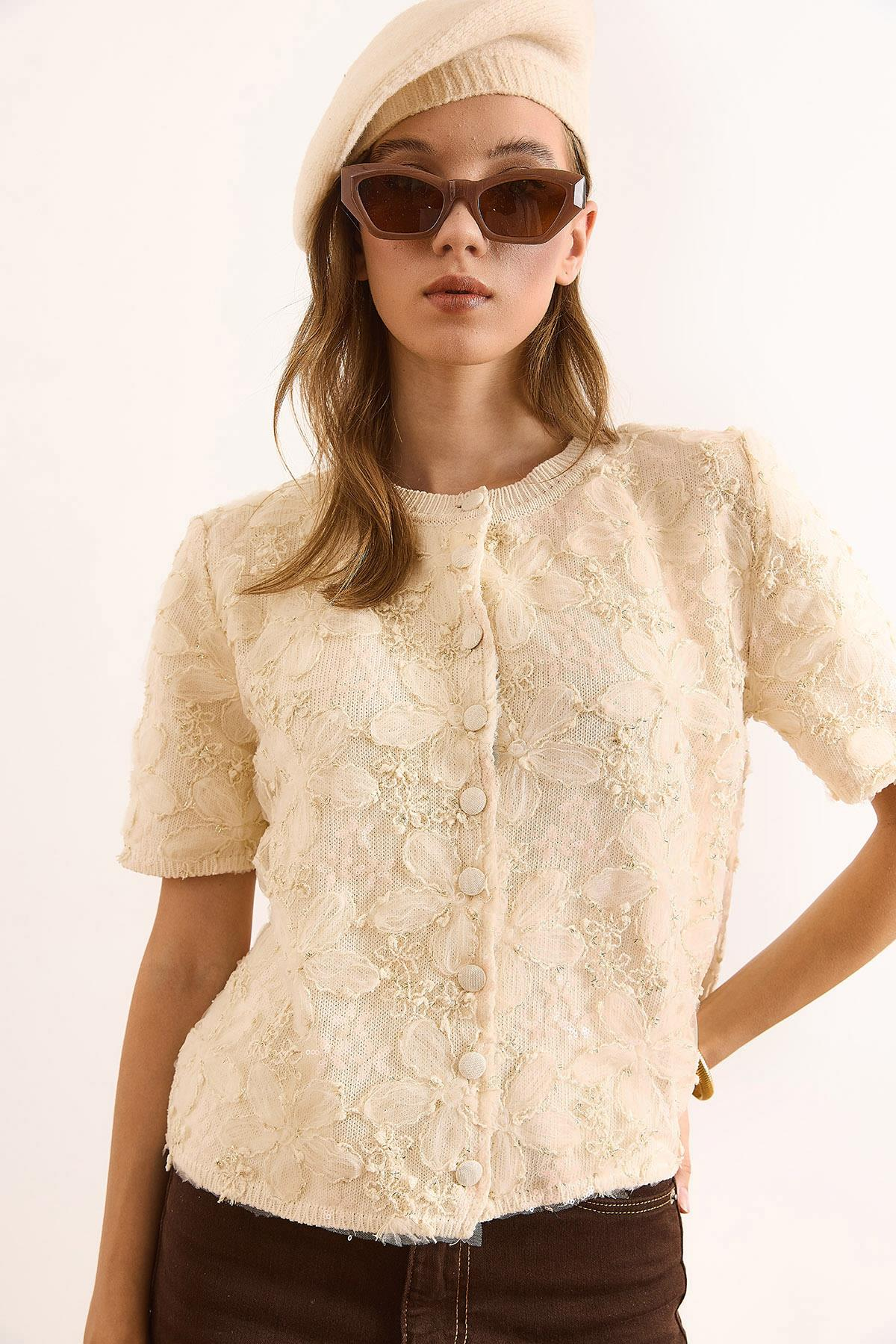 Bisiklet Yaka Garnili Triko Hırka Taş (HRK-19000396)