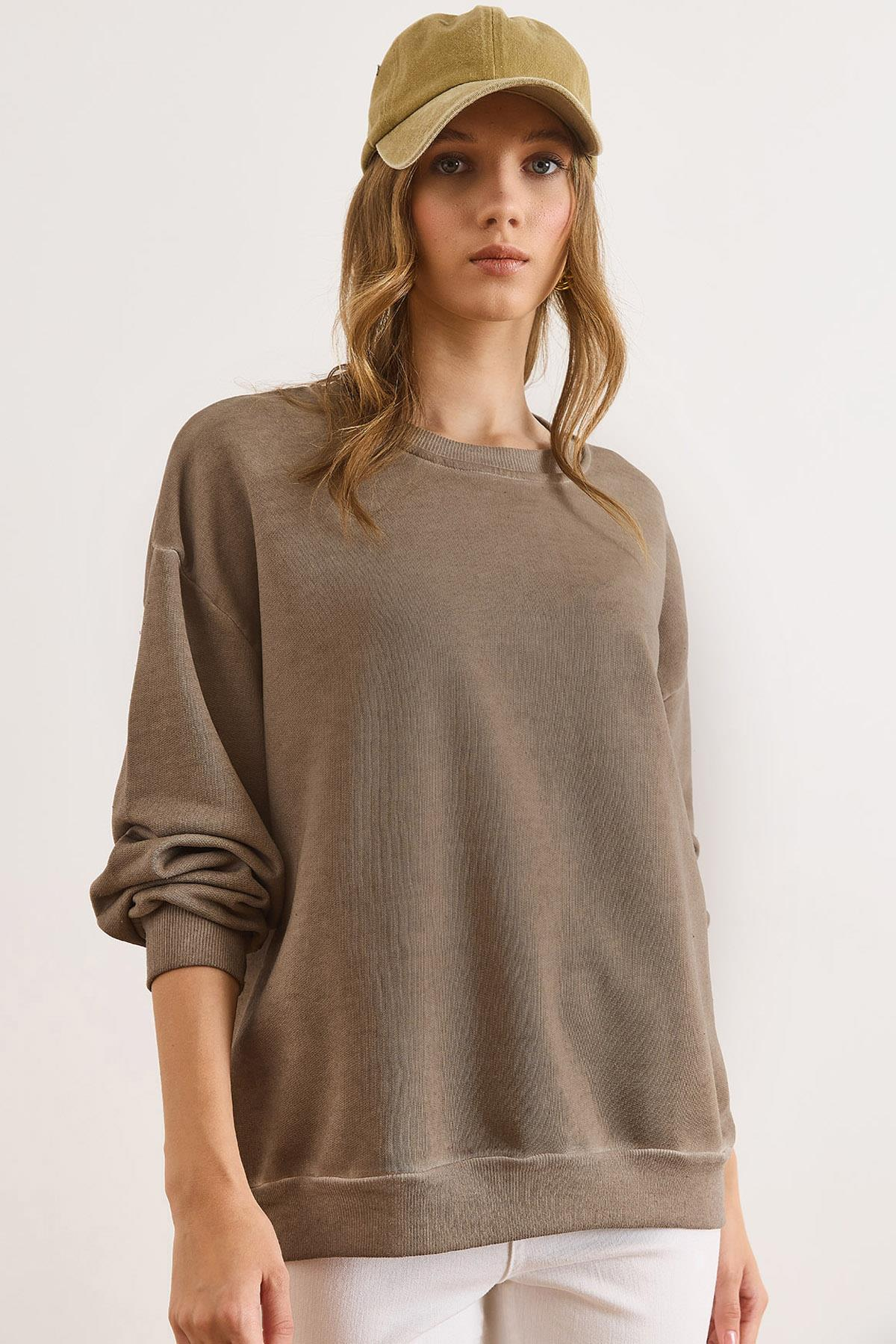 Bisiklet Yaka  Şardonsuz Yıkamalı Basic Sweatshirt Vizon
