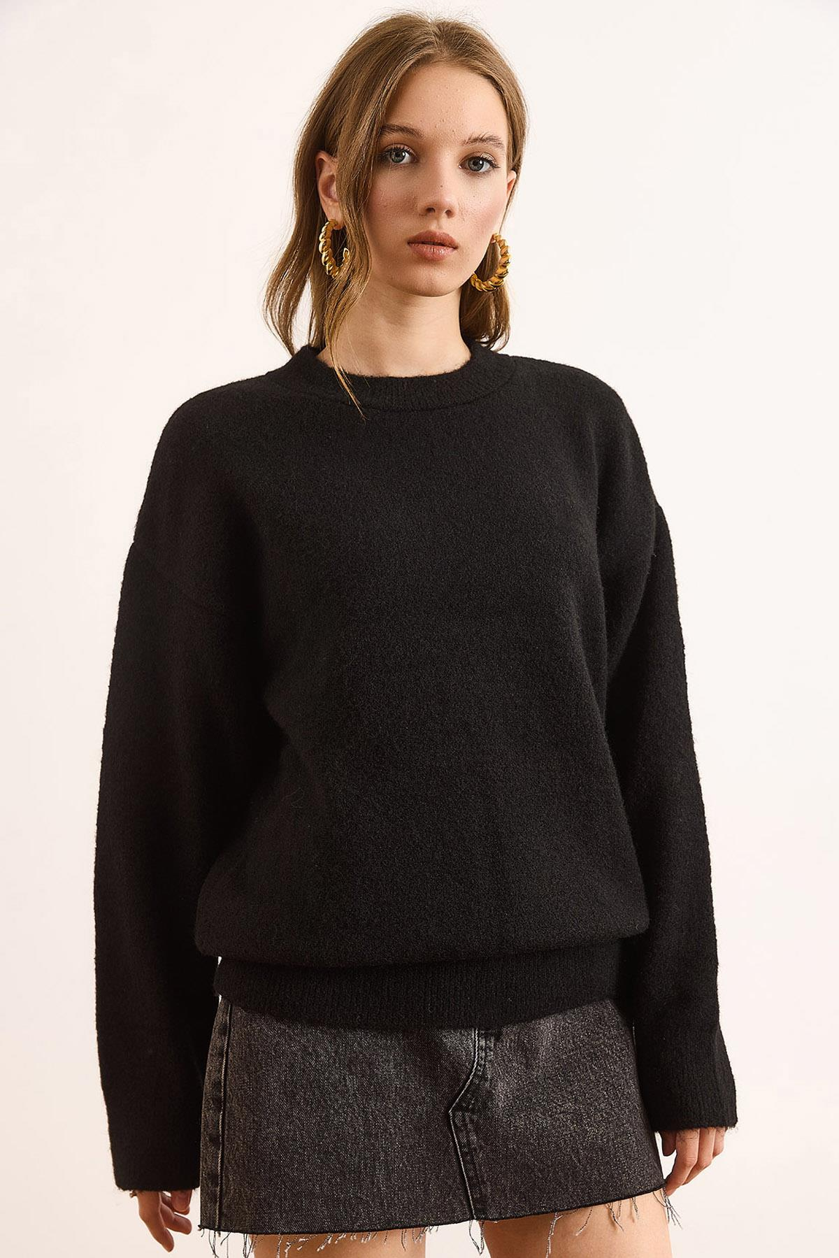 Bisiklet Yaka Yumuşak Dokulu Relaxed Fit Kazak Siyah (KZK-19000992)