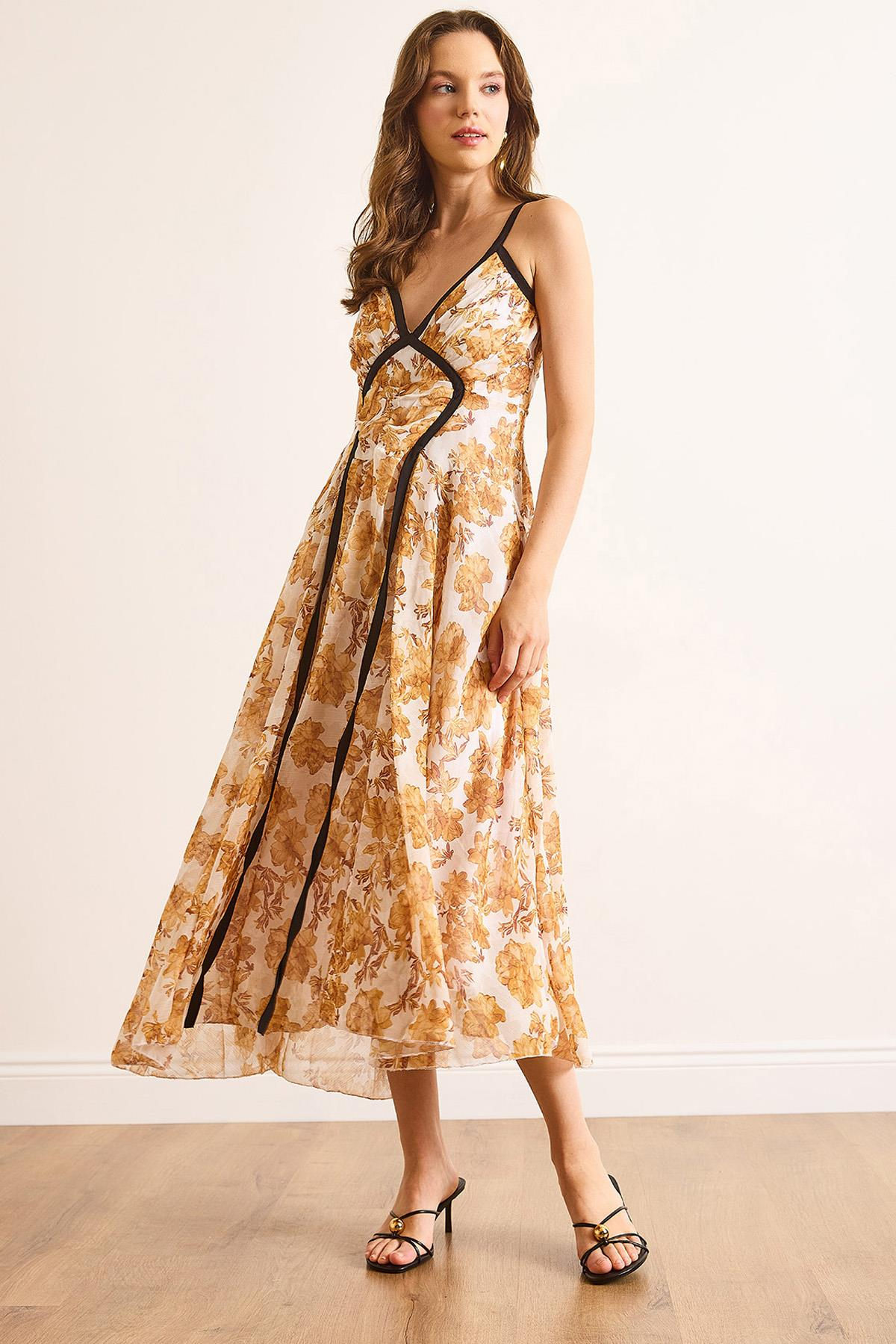 Biye Detaylı Askılı Astarlı Midi Elbise Camel (ELB-19002509)