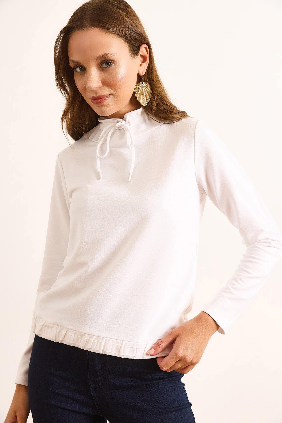 Boğazlı Bağcık Detaylı Yumuşak Dokulu 2 İp Sweatshirt Beyaz (SWT-19000720)