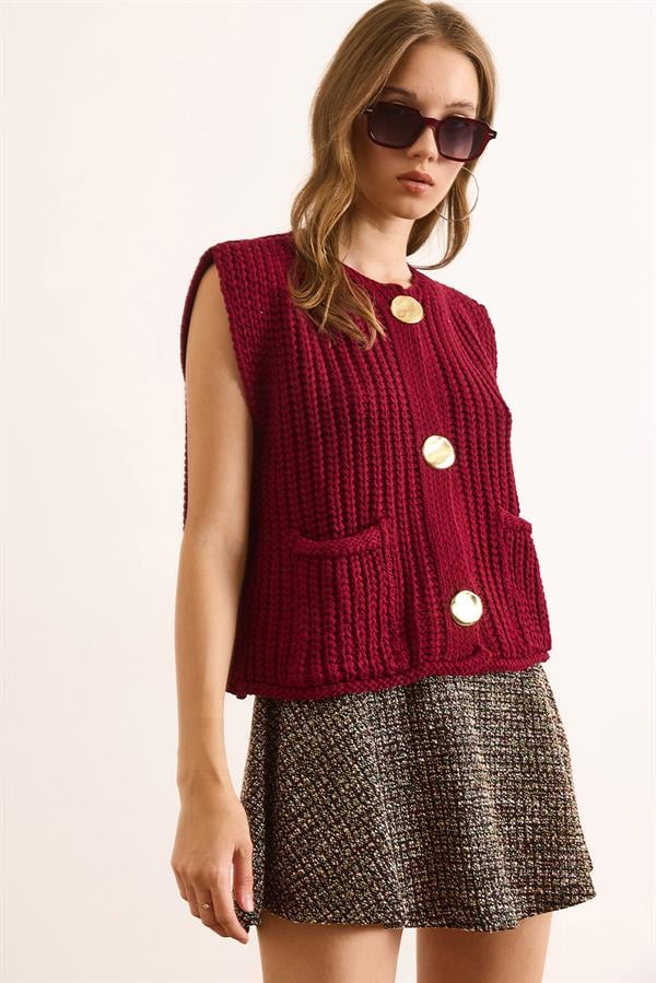 Büyük Gold Düğmeli Kalın Örgü Triko Yelek Bordo (YLK-19000087)
