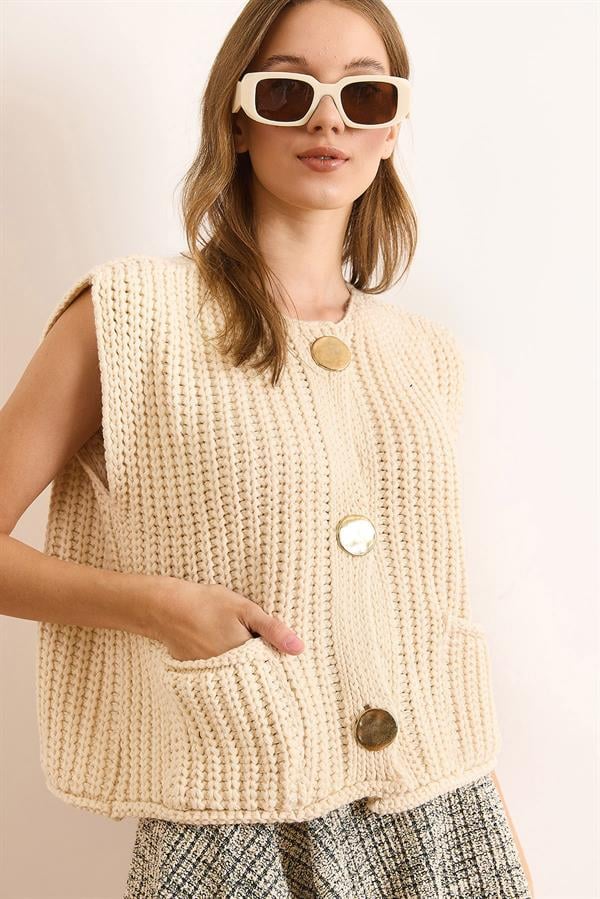 Büyük Gold Düğmeli Kalın Örgü Triko Yelek Taş (YLK-19000087)