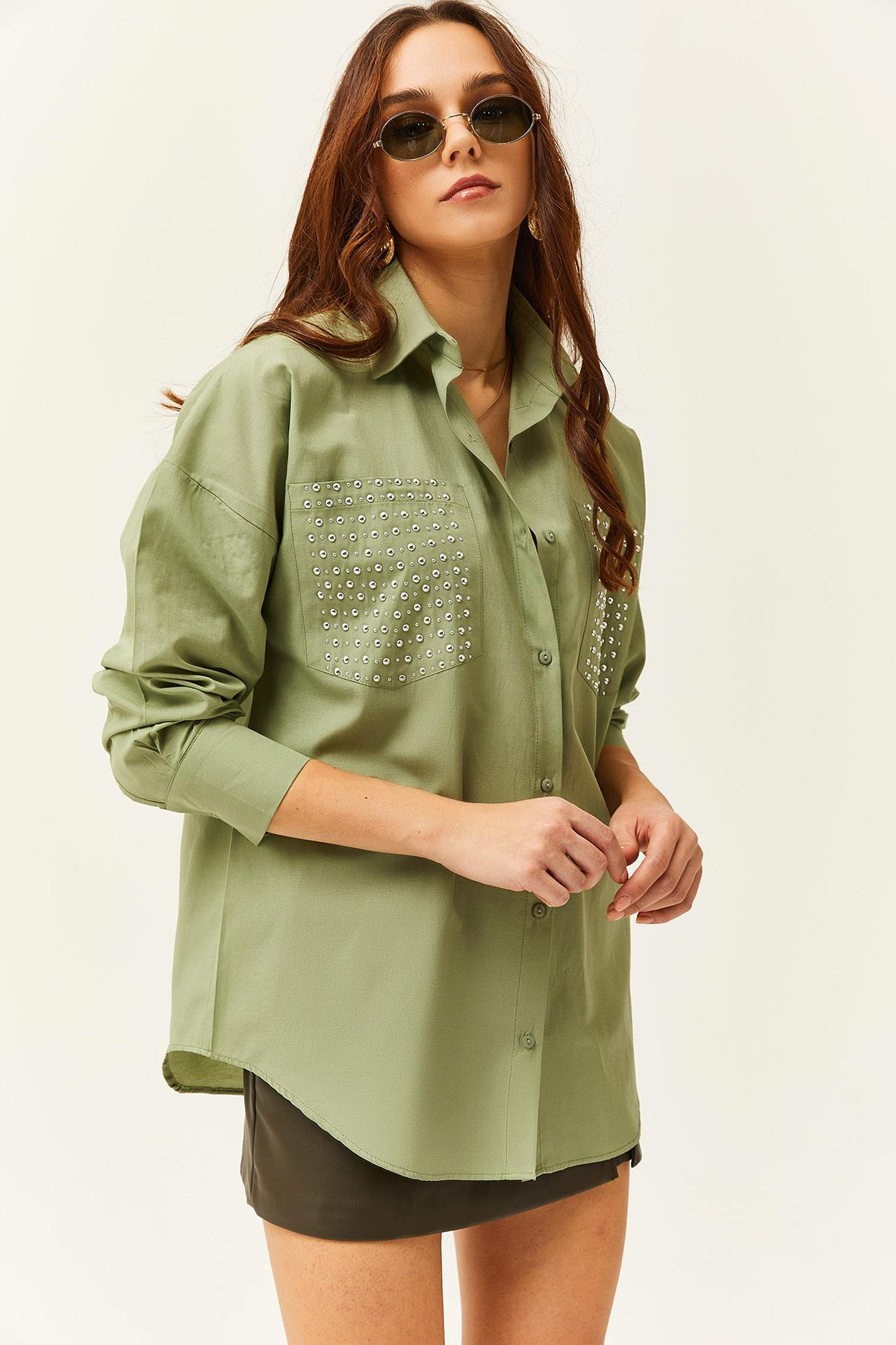 Cebi Zımba Detaylı Oversize Gömlek Küf Yeşili (GML-19001167)