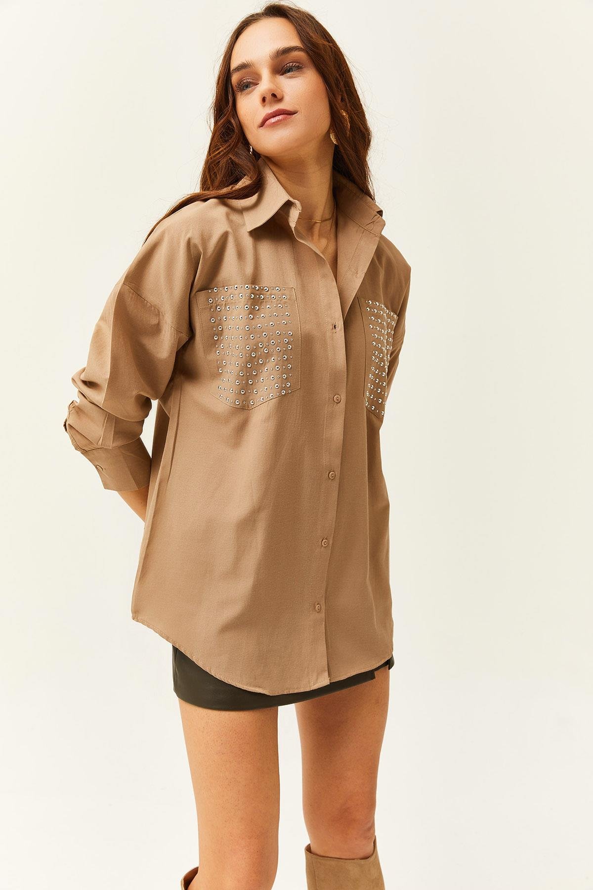 Cebi Zımba Detaylı Oversize Gömlek Vizon (GML-19001167)