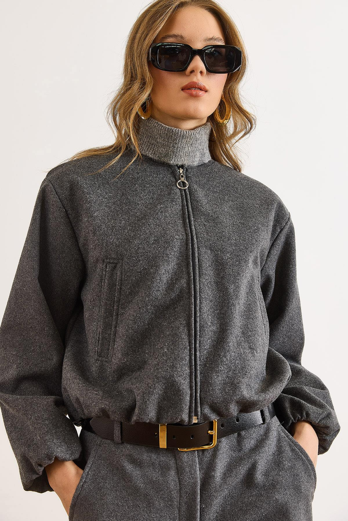 Cepli Astarlı Bisiklet Yaka Crop Kaşe Ceket Füme (CKT-19000485)