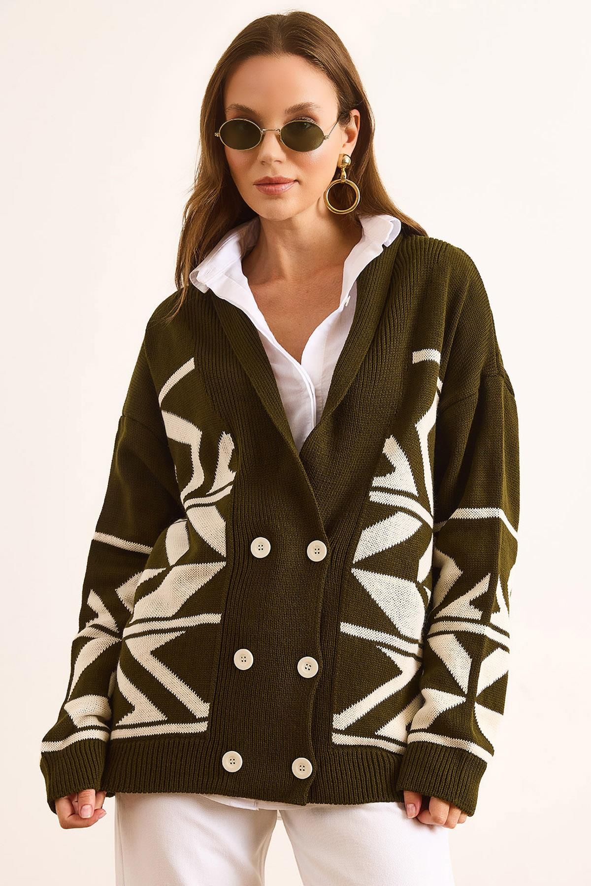 Çift Düğmeli Oversize Triko Hırka Haki