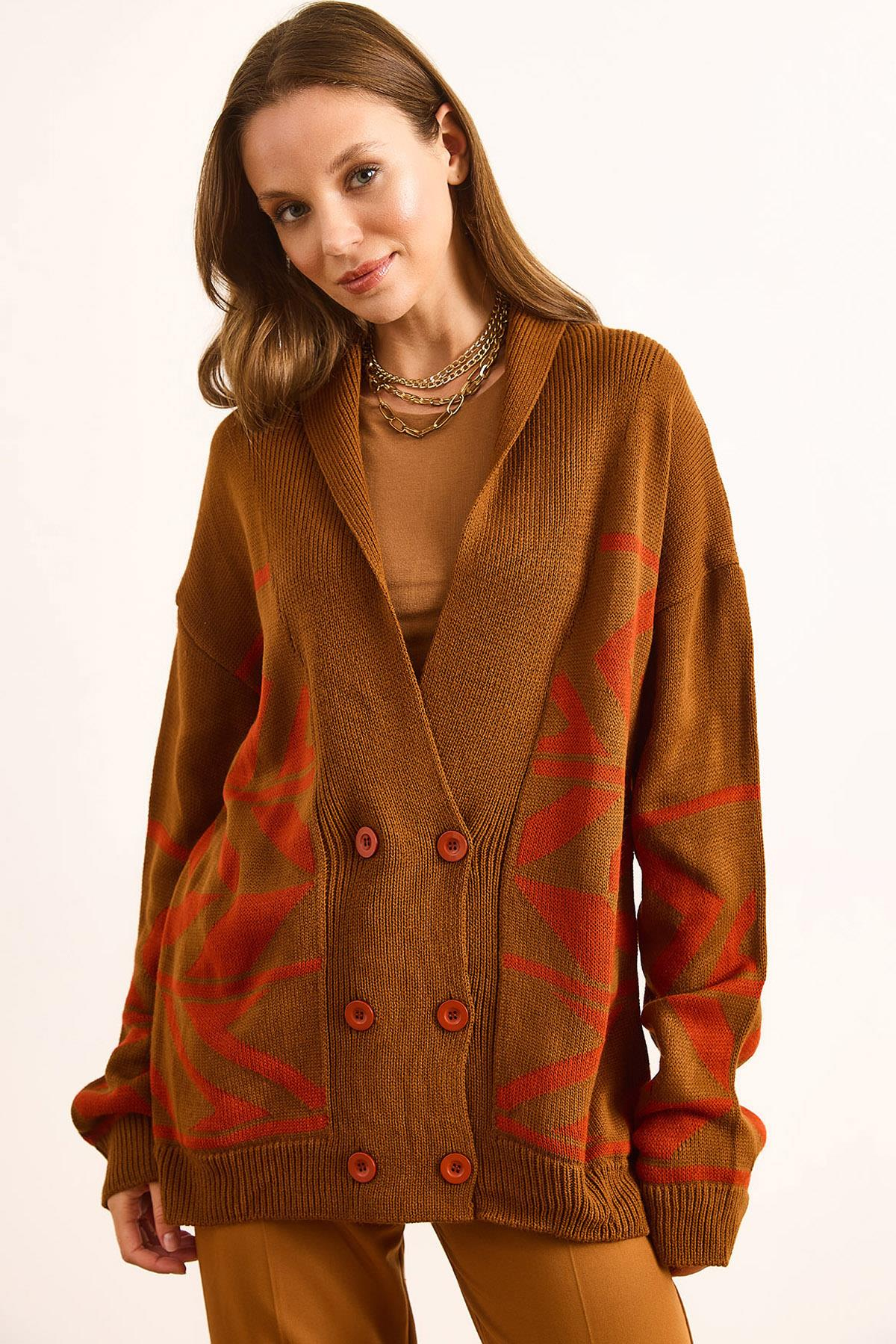 Çift Düğmeli Oversize Triko Hırka Taba (HRK-19000364)