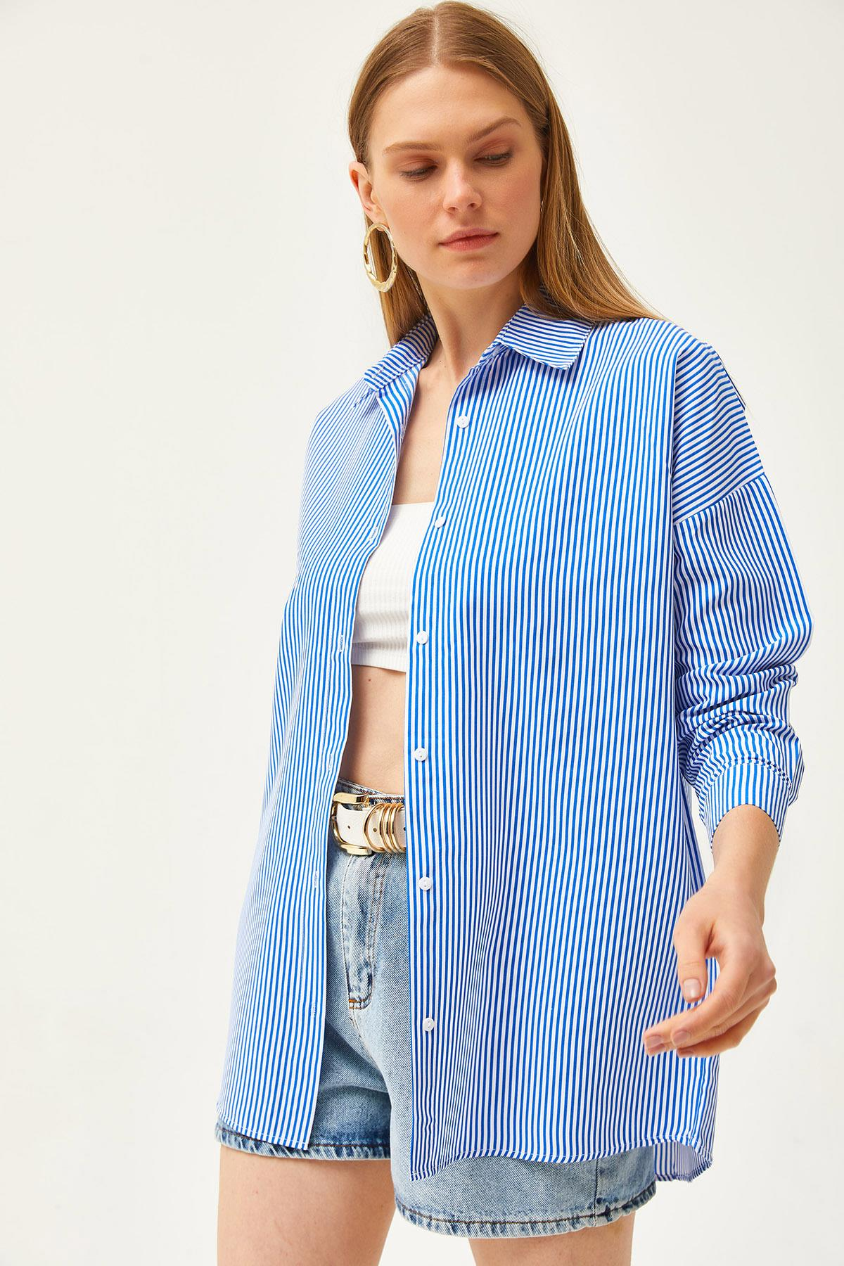 Çizgili Boyfriend Dokuma Gömlek Lacivert Çizgili Boyfriend Dokuma Gömlek Bebe Mavi