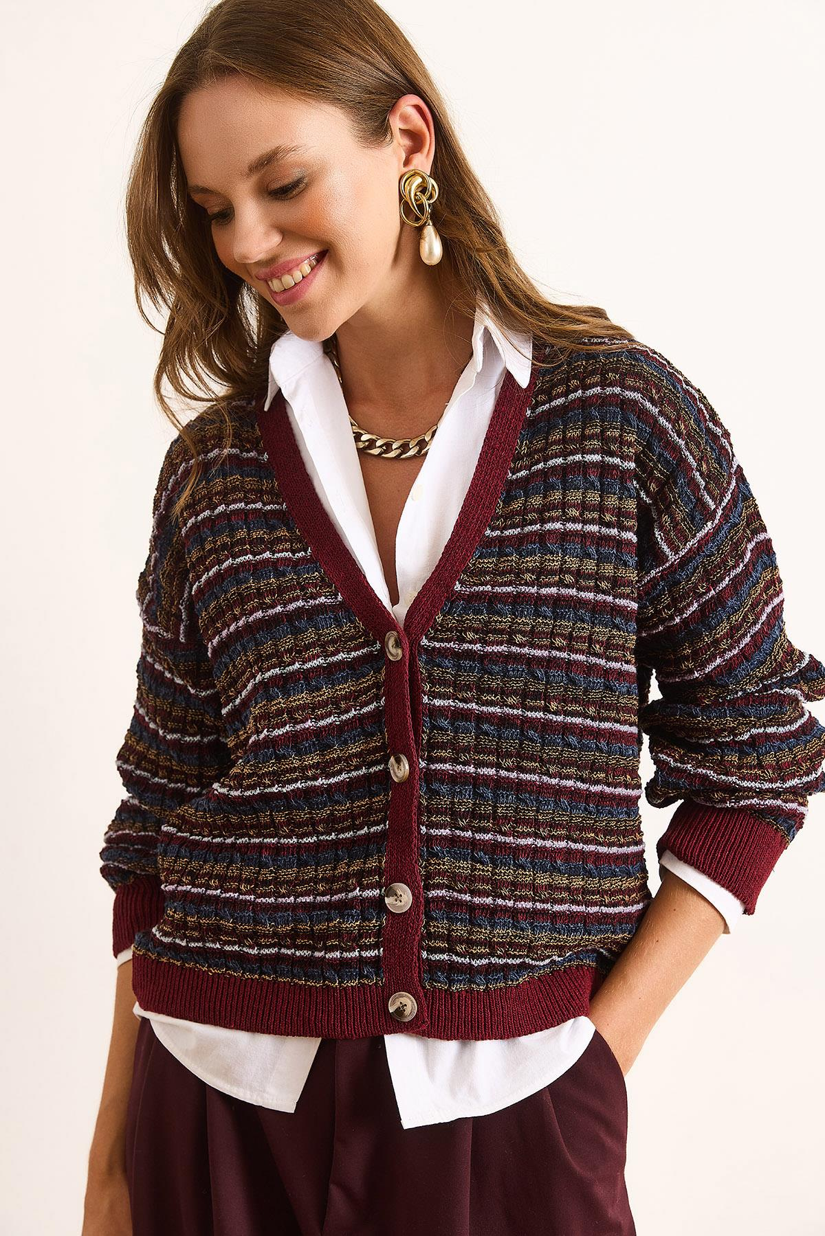 Çizgili Dokulu Triko Hırka Bordo