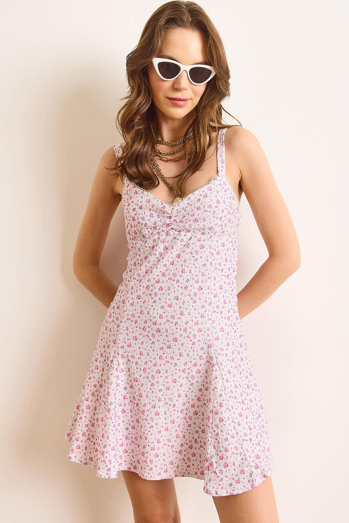 Dantel Detaylı Roba Büzgülü Astarlı Mini Kloş Elbise Beyaz Pembe (ELB-19002512)