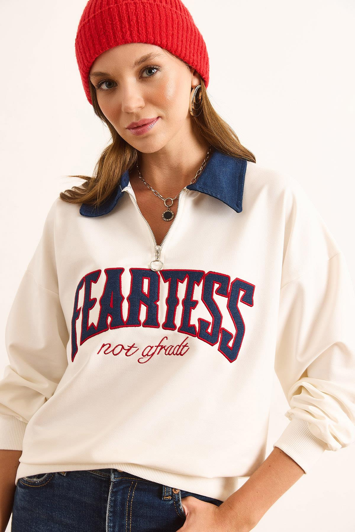 Denim Yaka Fermuarlı Yazılı Oversize Sweatshirt Beyaz