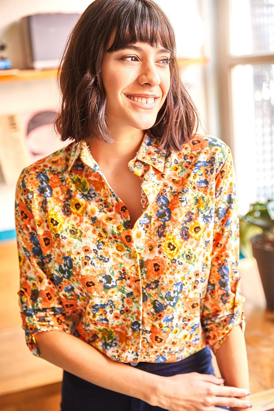 Desenli Gömlek Turuncu Çiçekli