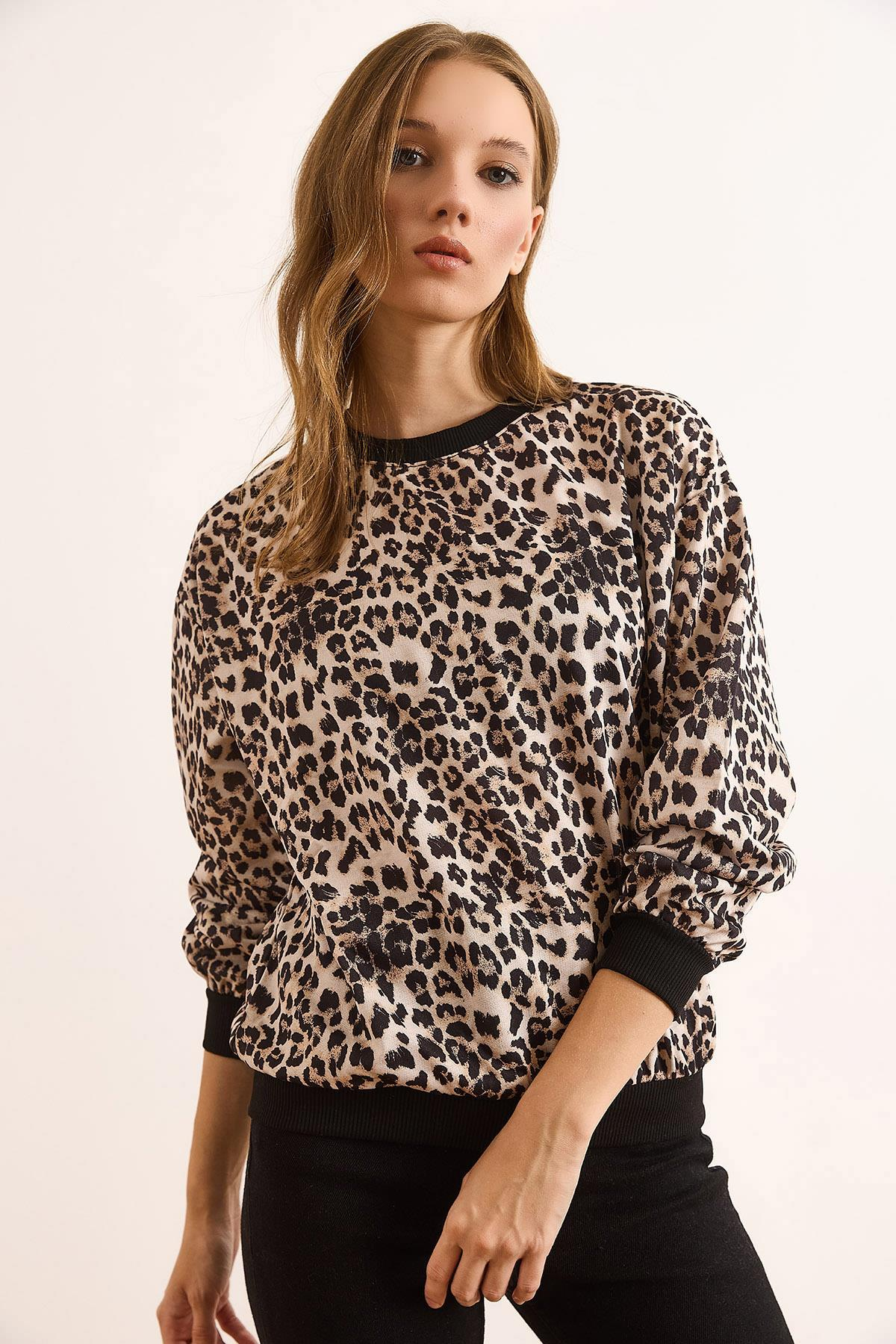 Dijital Leopar Baskılı İnce Sweatshirt Taş (SWT-19000748)