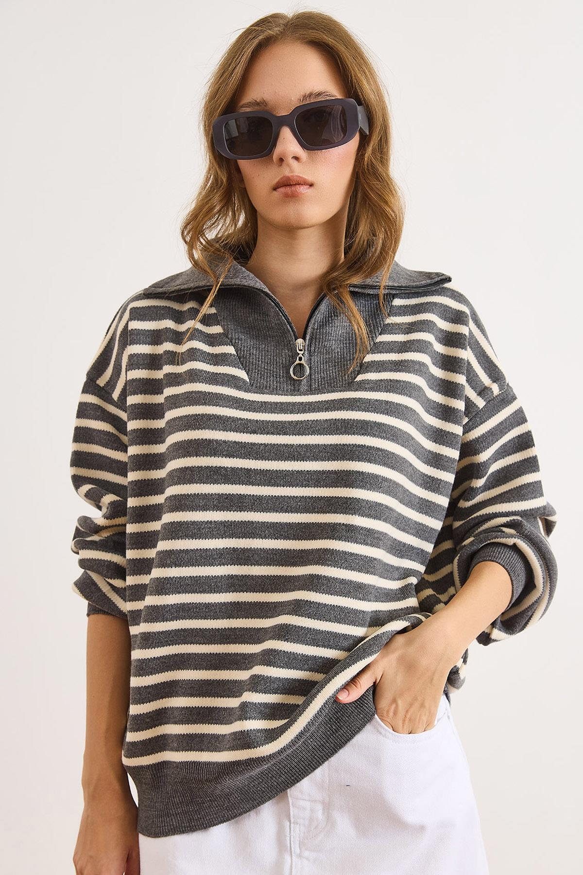 Dik Yaka Fermuarlı Salaş Triko Kazak Füme (KZK-19001001)