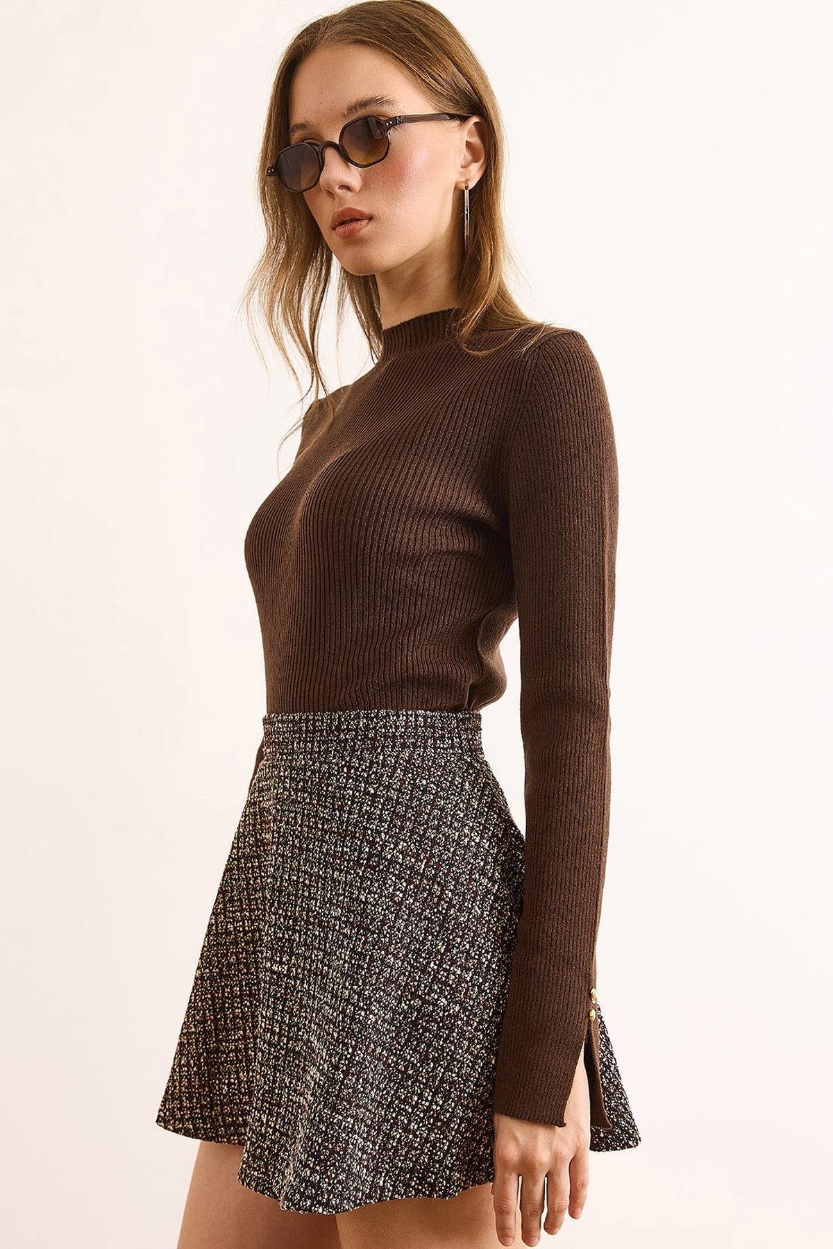 Dik Yaka Manşeti Yırtmaç Düğme Detaylı Triko Kazak Kahverengi (KZK-19000995)