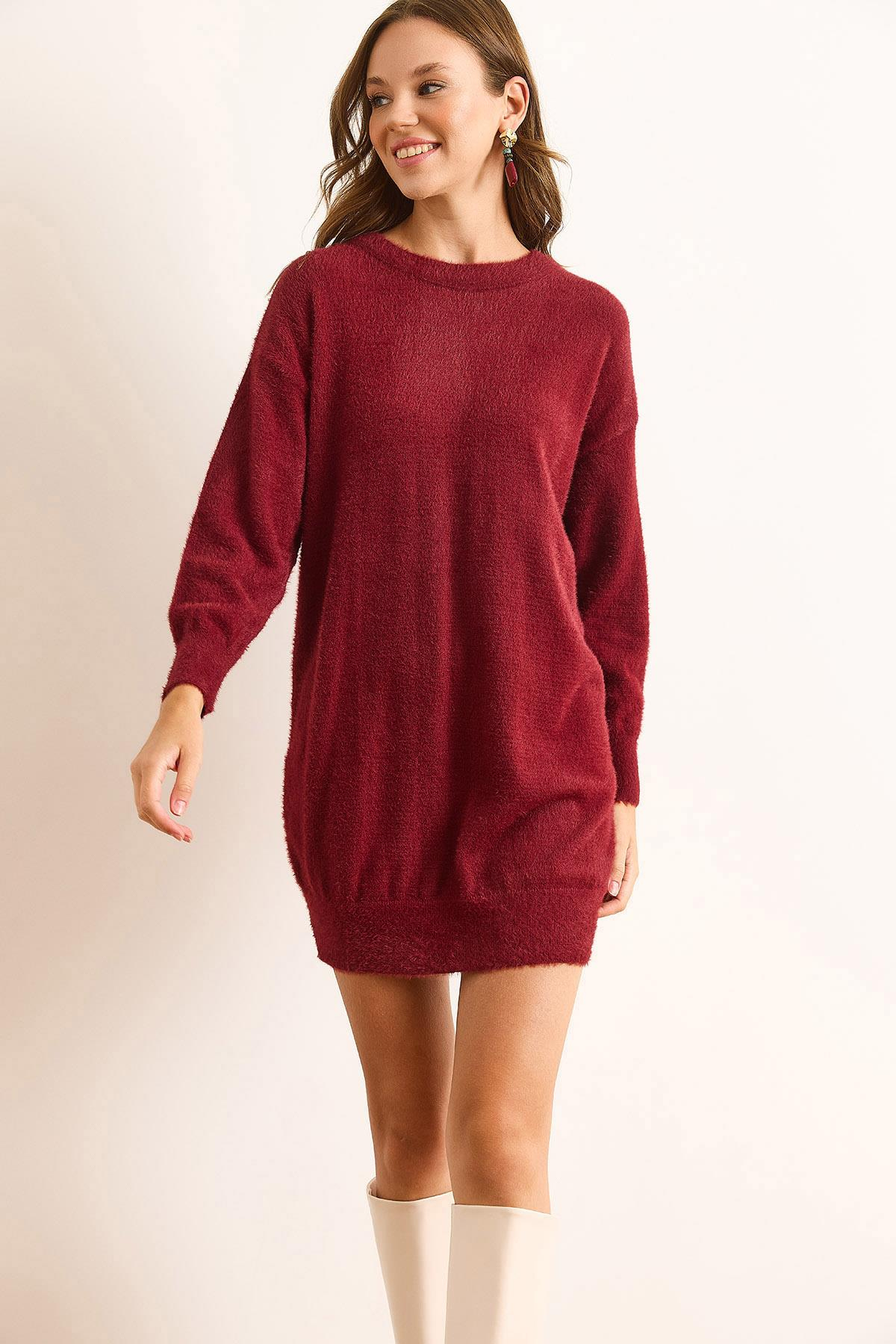 Dik Yaka Yumuşak Dokulu Sakal Triko Tunik Elbise Bordo (ELB-19002325)
