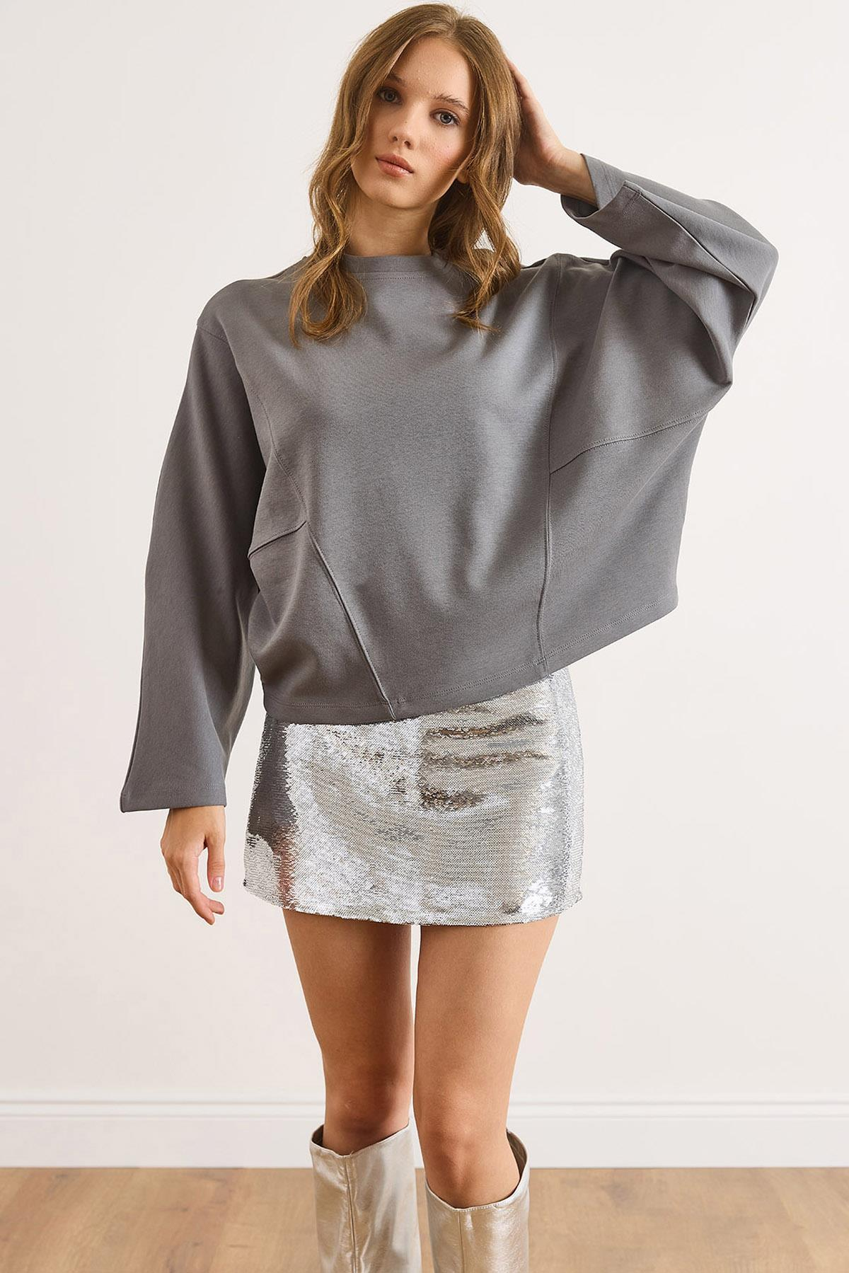 Dikiş Detaylı Yarasa Model Şardonsuz İnterlok Sweatshirt Füme