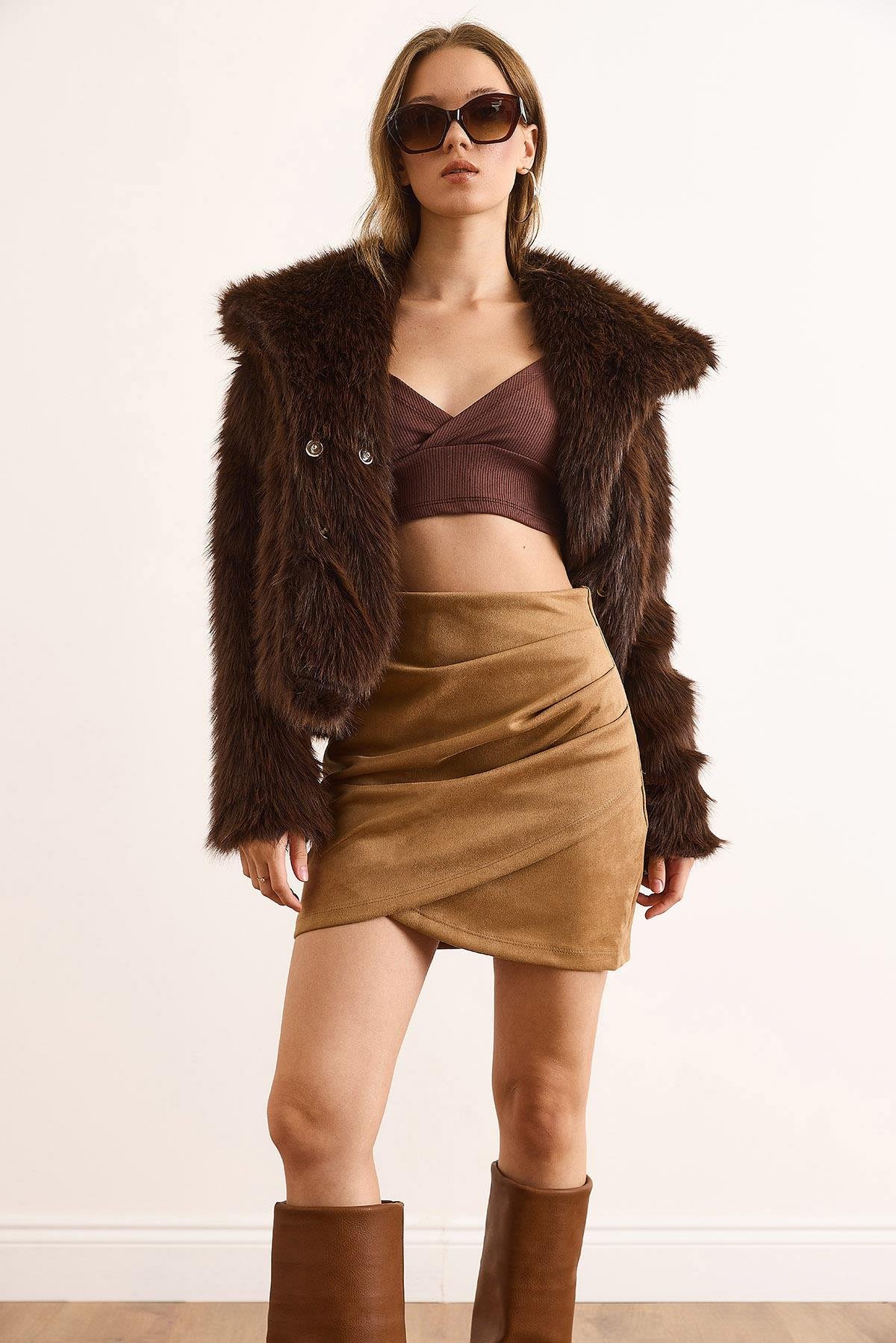 Drape Detaylı Yanı Fermuarlı Mini Süet Etek Camel (ETK-19000354)