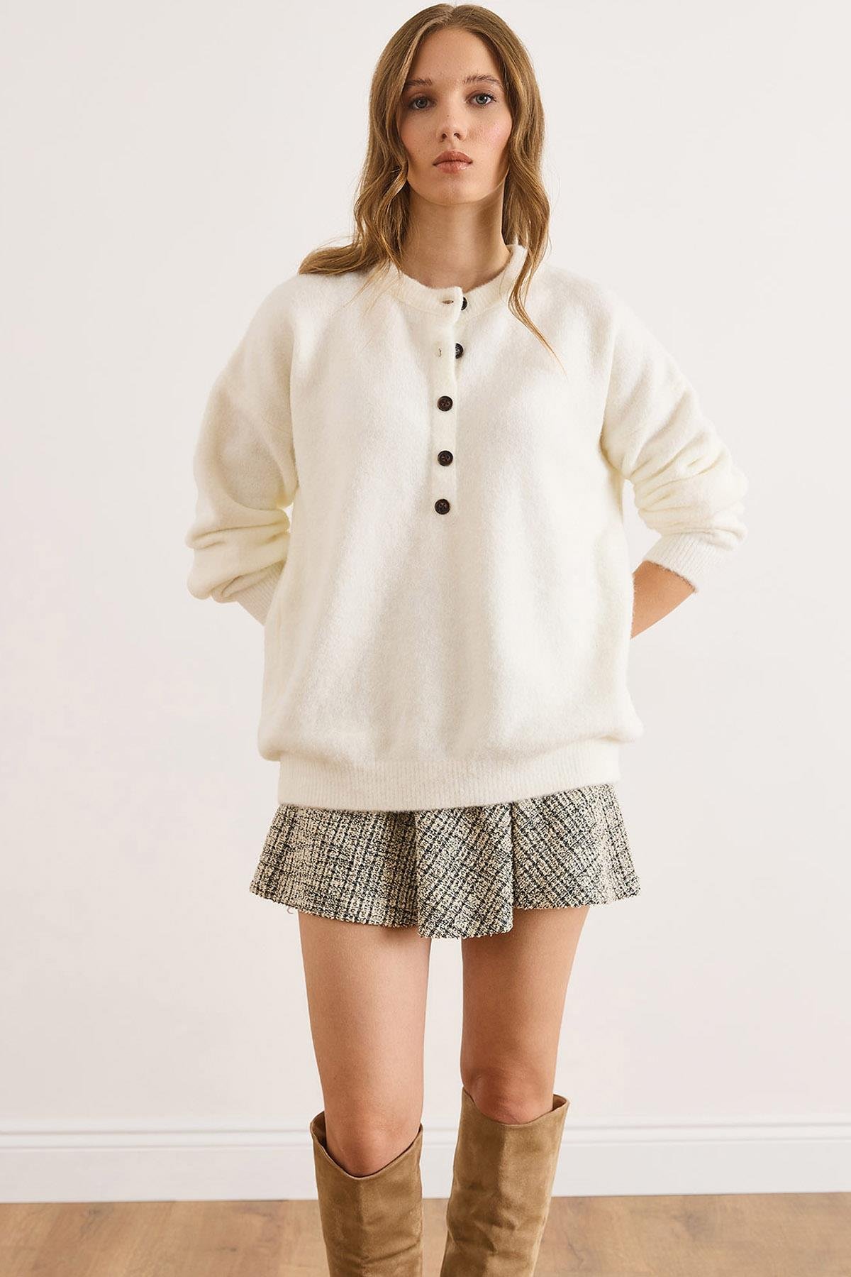Düğmeli Yumuşak Dokulu Triko Kazak Beyaz