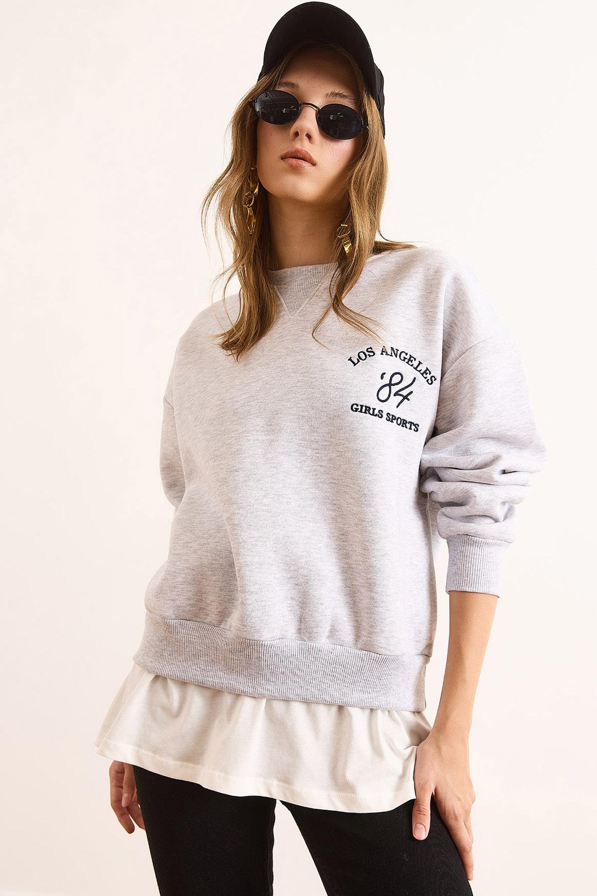 Eteği Garnili Yaka Detaylı Şardonlu Kalın Sweatshirt Gri Melanj (SWT-19000743)