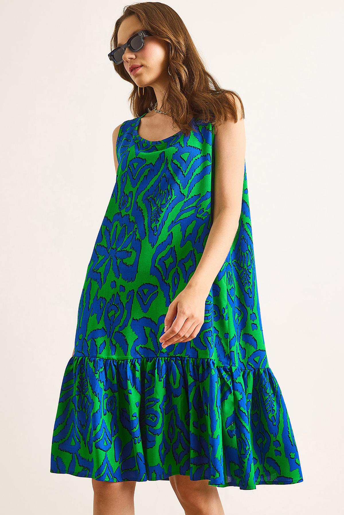 Eteği Volanlı Dokuma Viskon Elbise Yeşil Mavi (ELB-19002502)