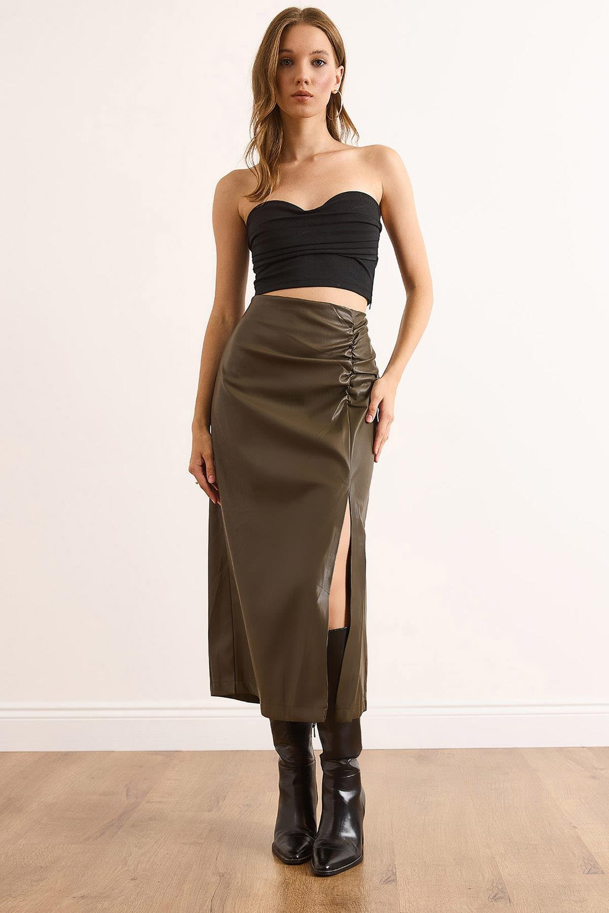 Fermuarlı Drape Detaylı Yırtmaçlı İçi Kürklü Suni Deri Etek Haki (ETK-19000353)