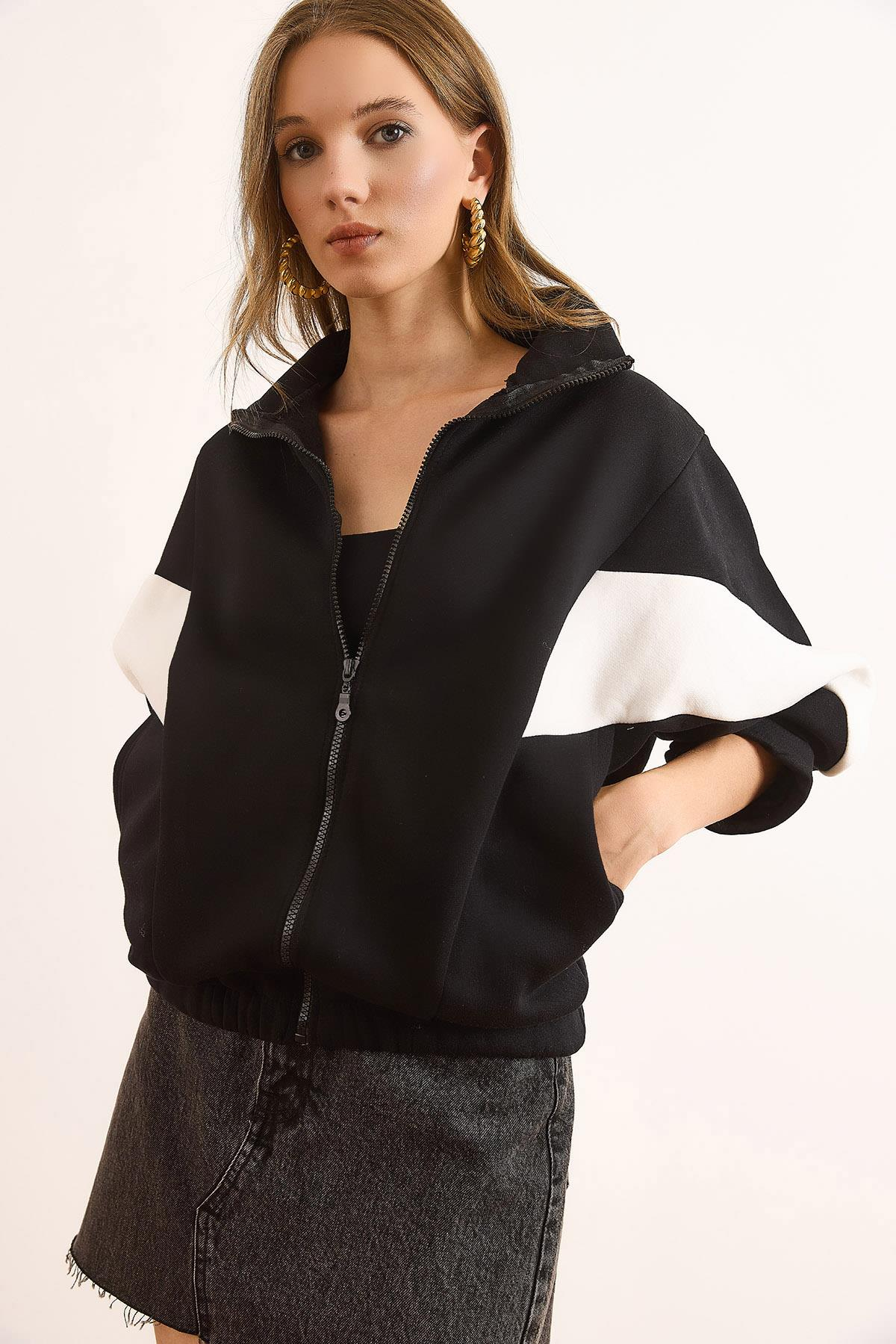 Fermuarlı Şardonlu Oversize Bloklu Sweatshirt Siyah (SWT-19000656)