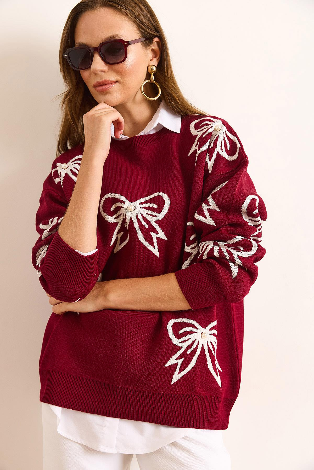 Fiyonk Detaylı Oversize Triko Kazak Bordo (KZK-19000971)