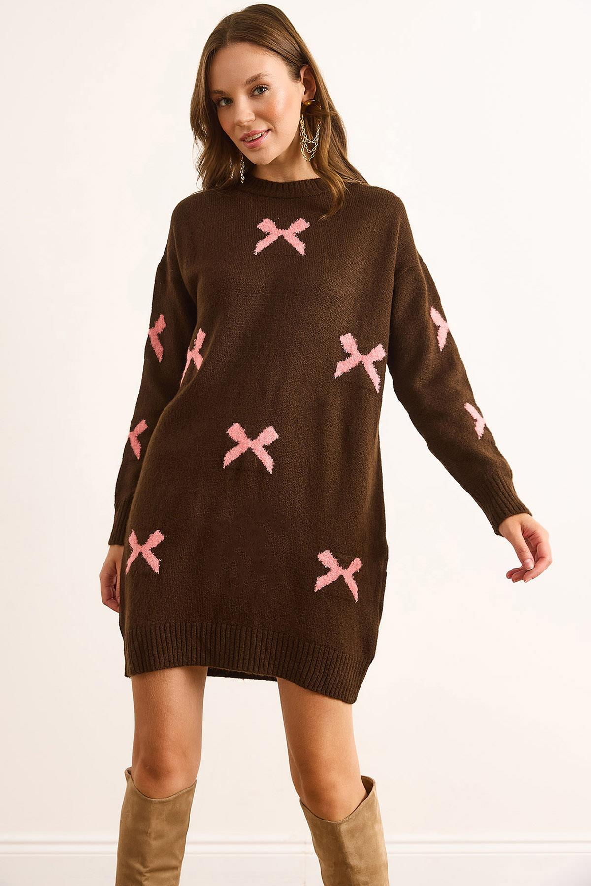 Fiyonk Detaylı Triko Tunik Elbise Kahverengi (ELB-19002533)