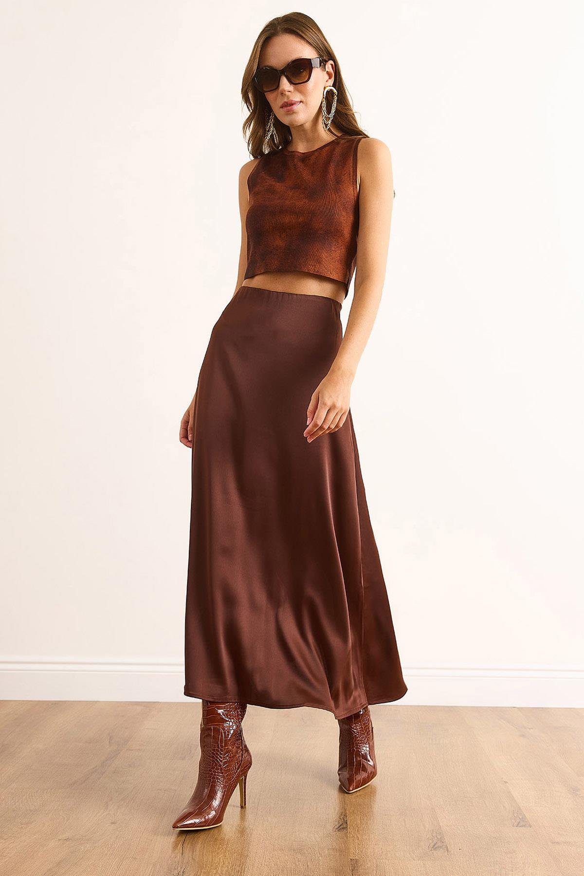 Gizli Fermuarlı Saten Dökümlü Midi Etek Kahverengi