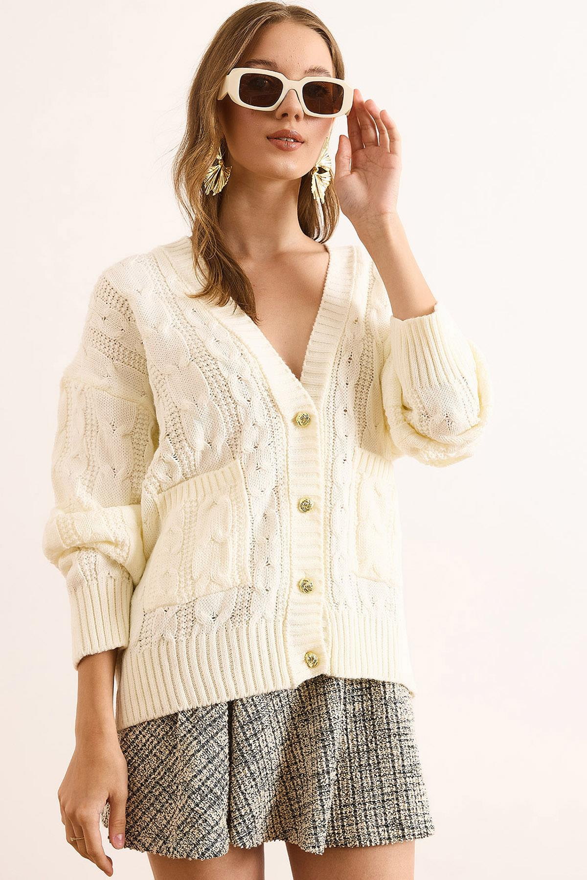 Gold Düğmeli Cepli Salaş Triko Hırka Ekru (HRK-19000392)
