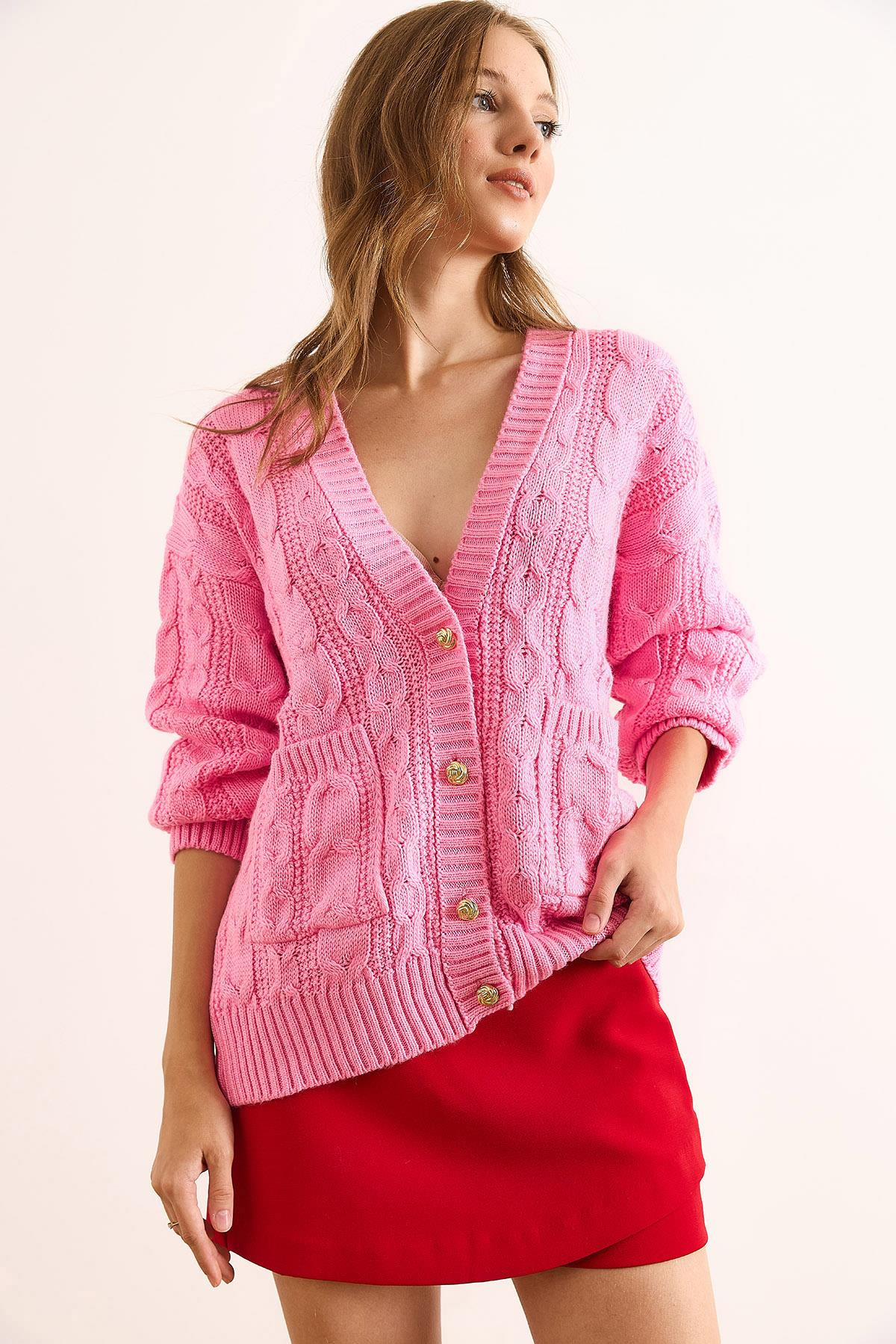 Gold Düğmeli Cepli Salaş Triko Hırka Pembe (HRK-19000392)