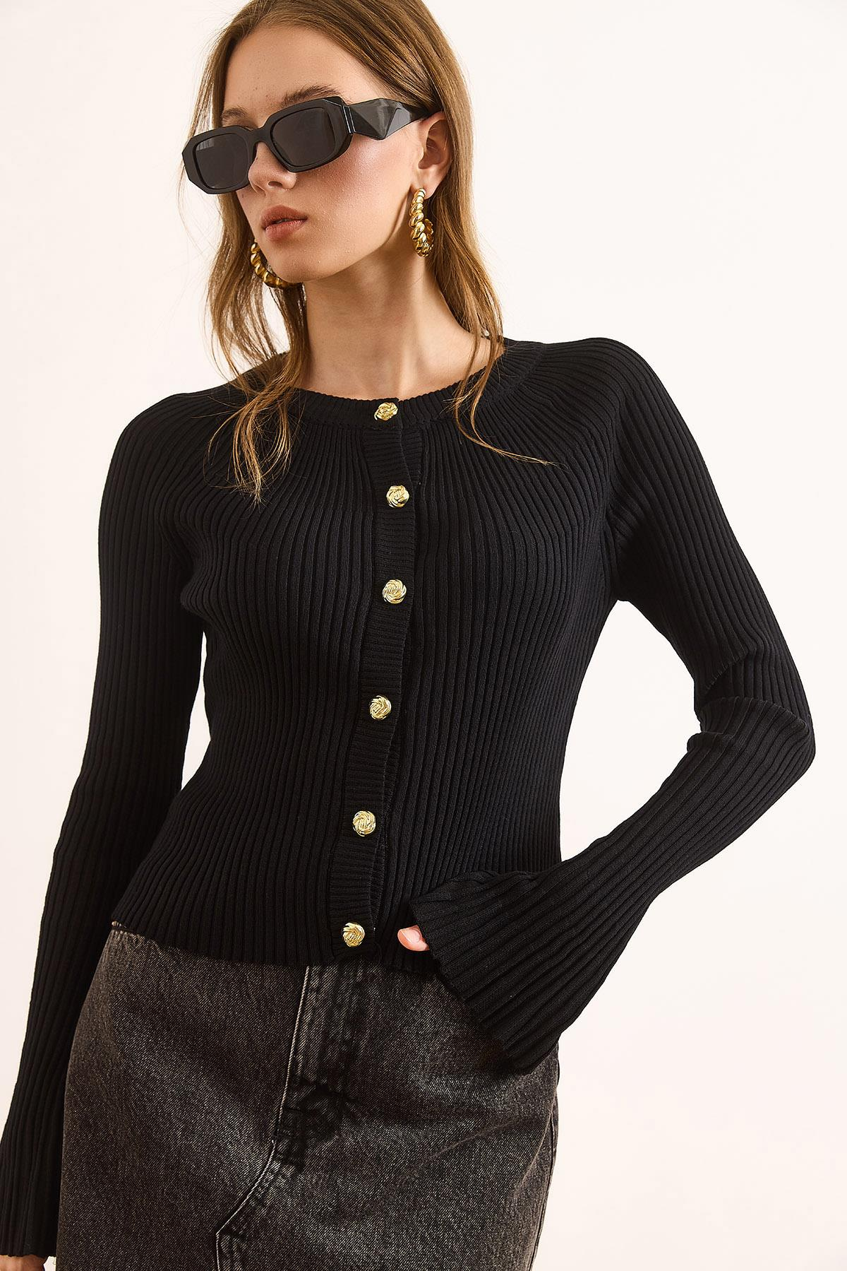 Gold Düğmeli İspanyol Kol Fitilli Hırka Siyah (HRK-19000388)
