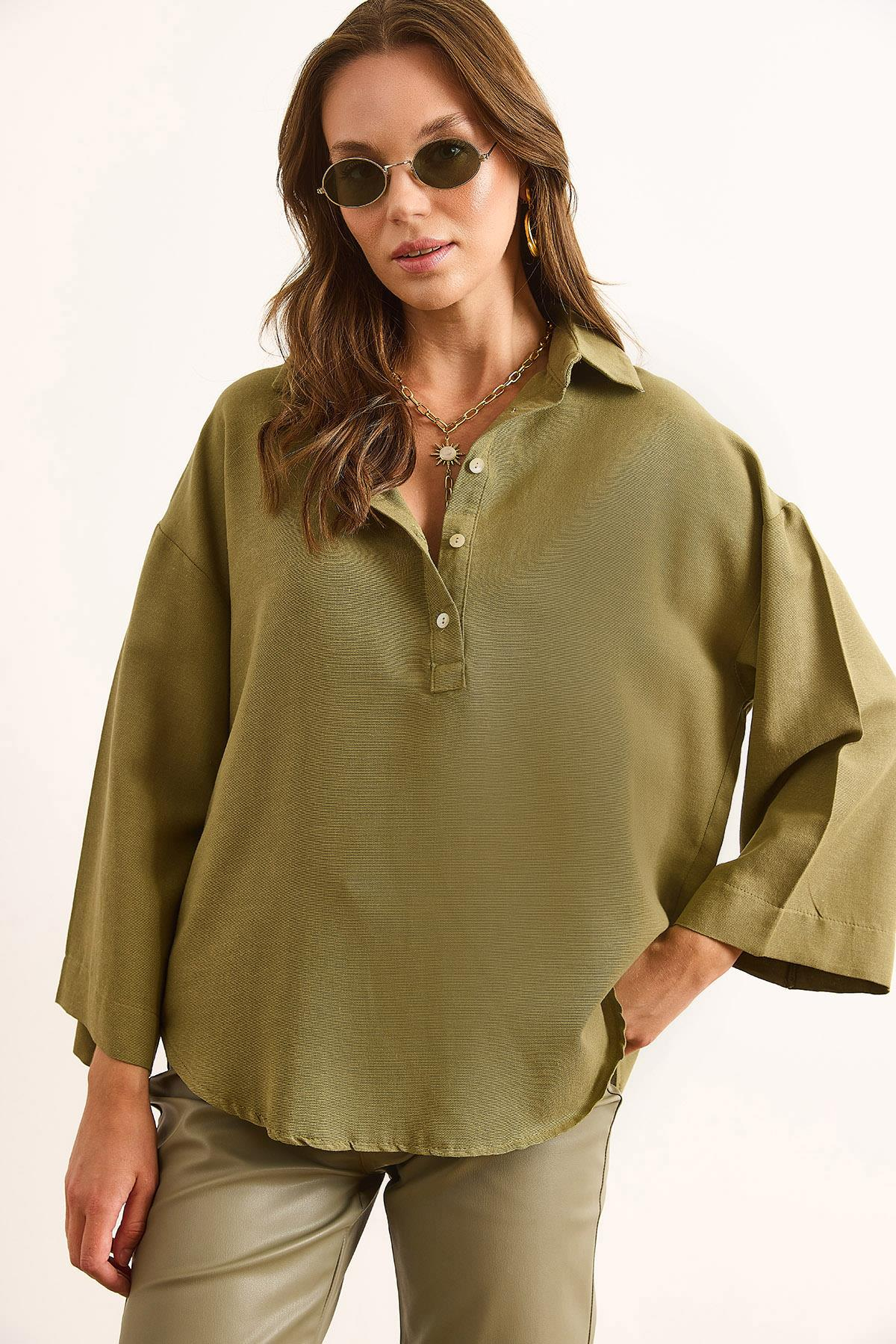 Gömlek Yaka Düğmeli Dökümlü Viskon Bluz Haki