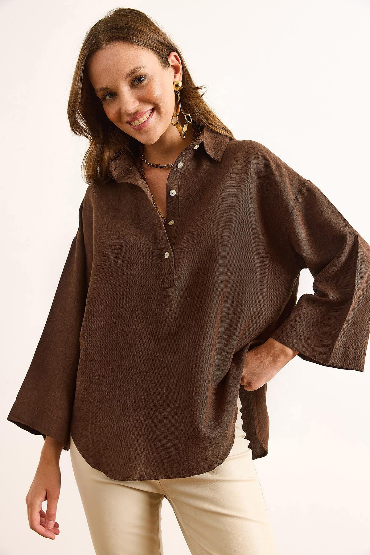 Gömlek Yaka Düğmeli Dökümlü Viskon Bluz Kahverengi (BLZ-19003088)