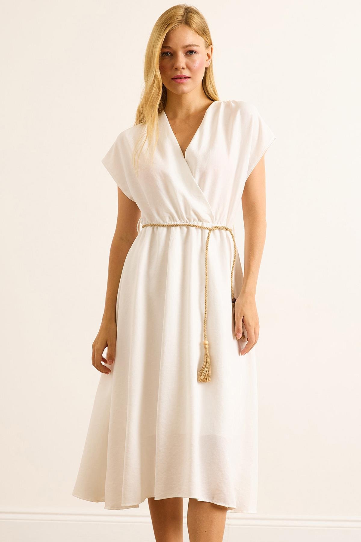 Hasır Bağcıklı Yarasa Beli Lastikli Elbise Beyaz (ELB-19002486)
