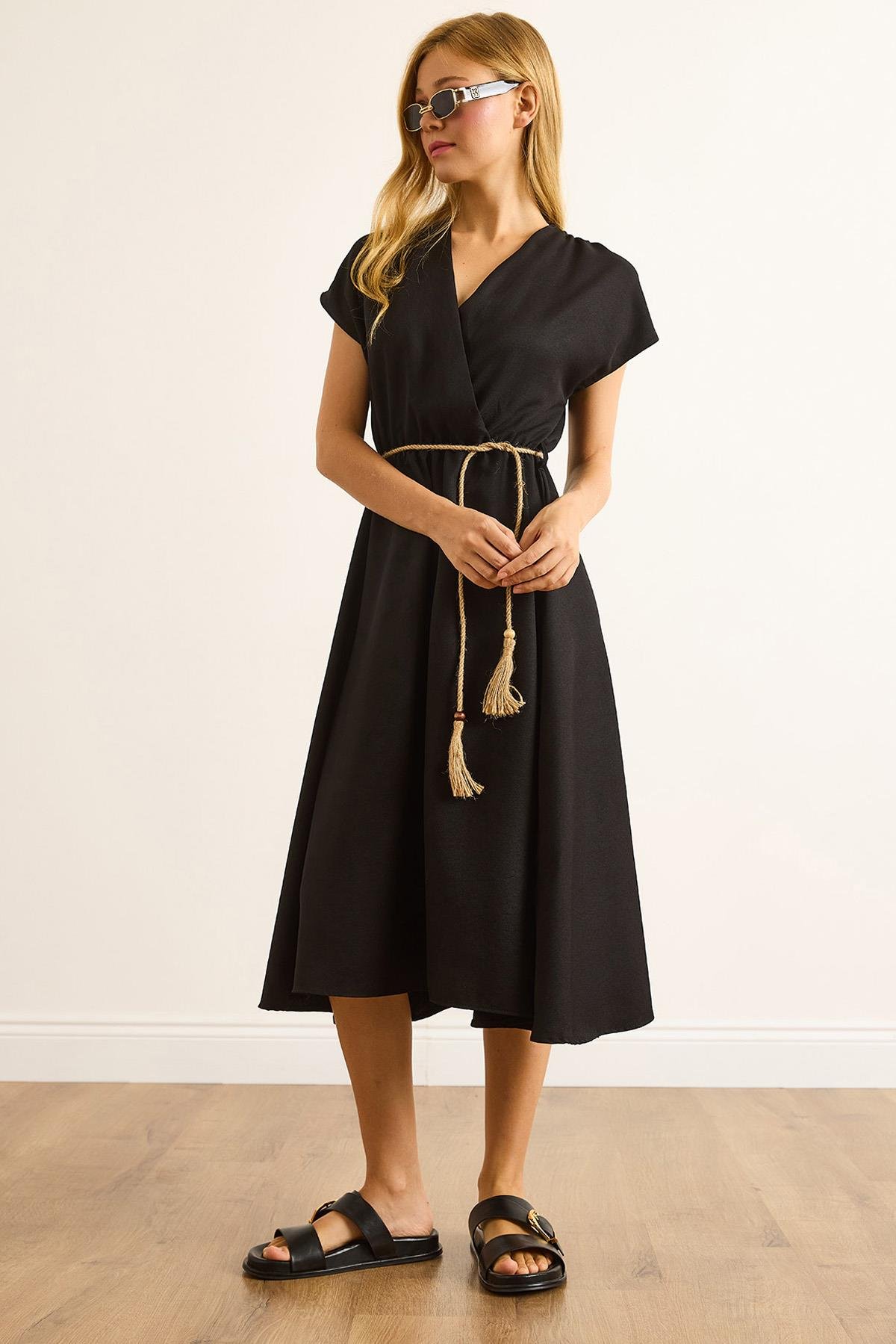 Hasır Bağcıklı Yarasa Beli Lastikli Elbise Siyah (ELB-19002486)